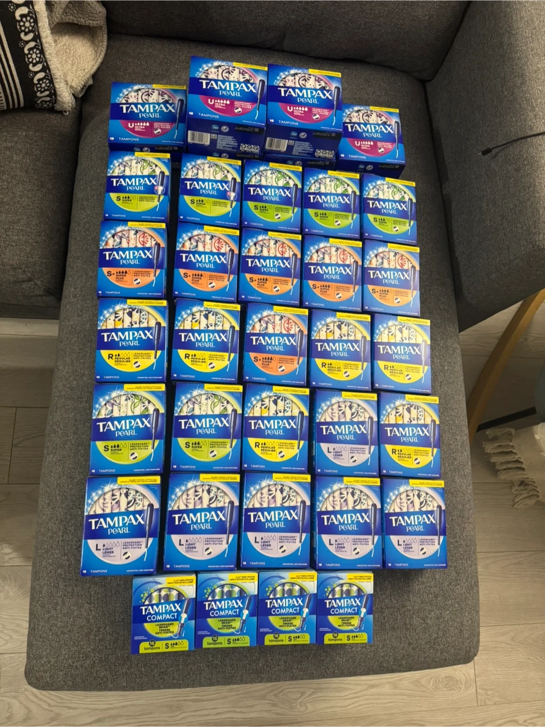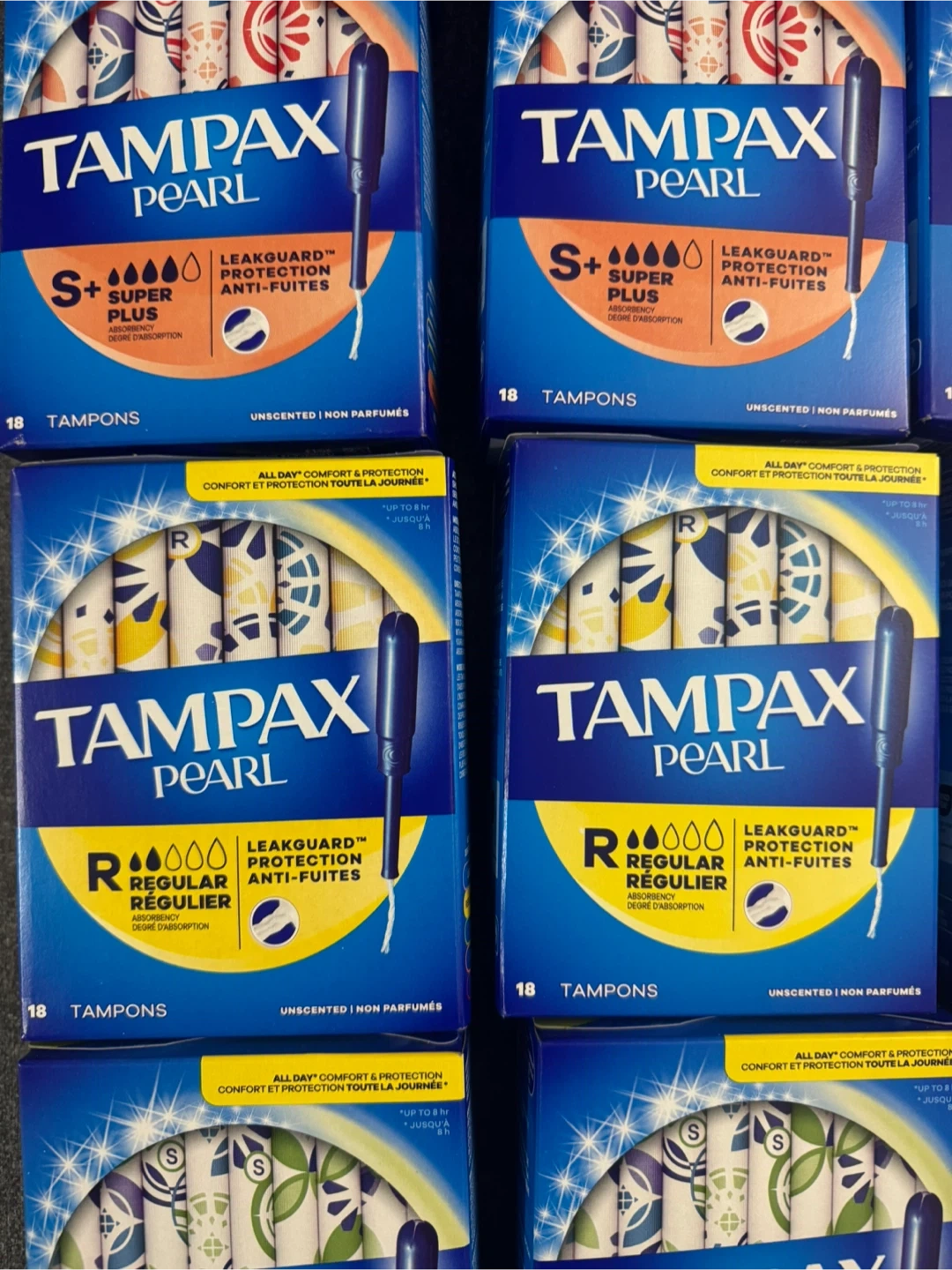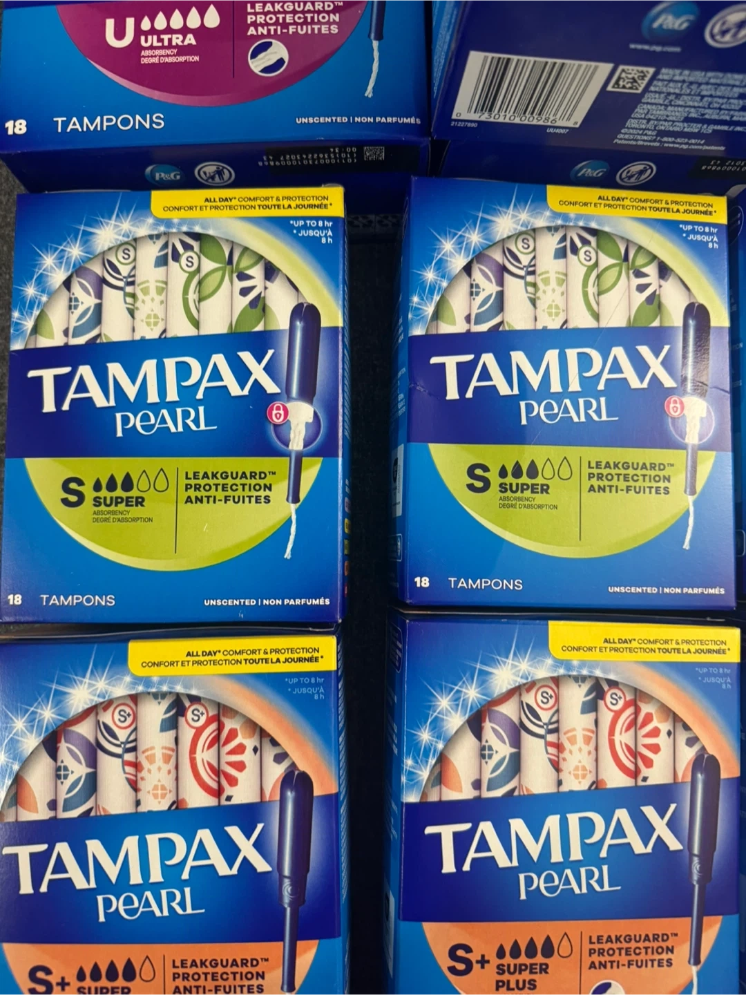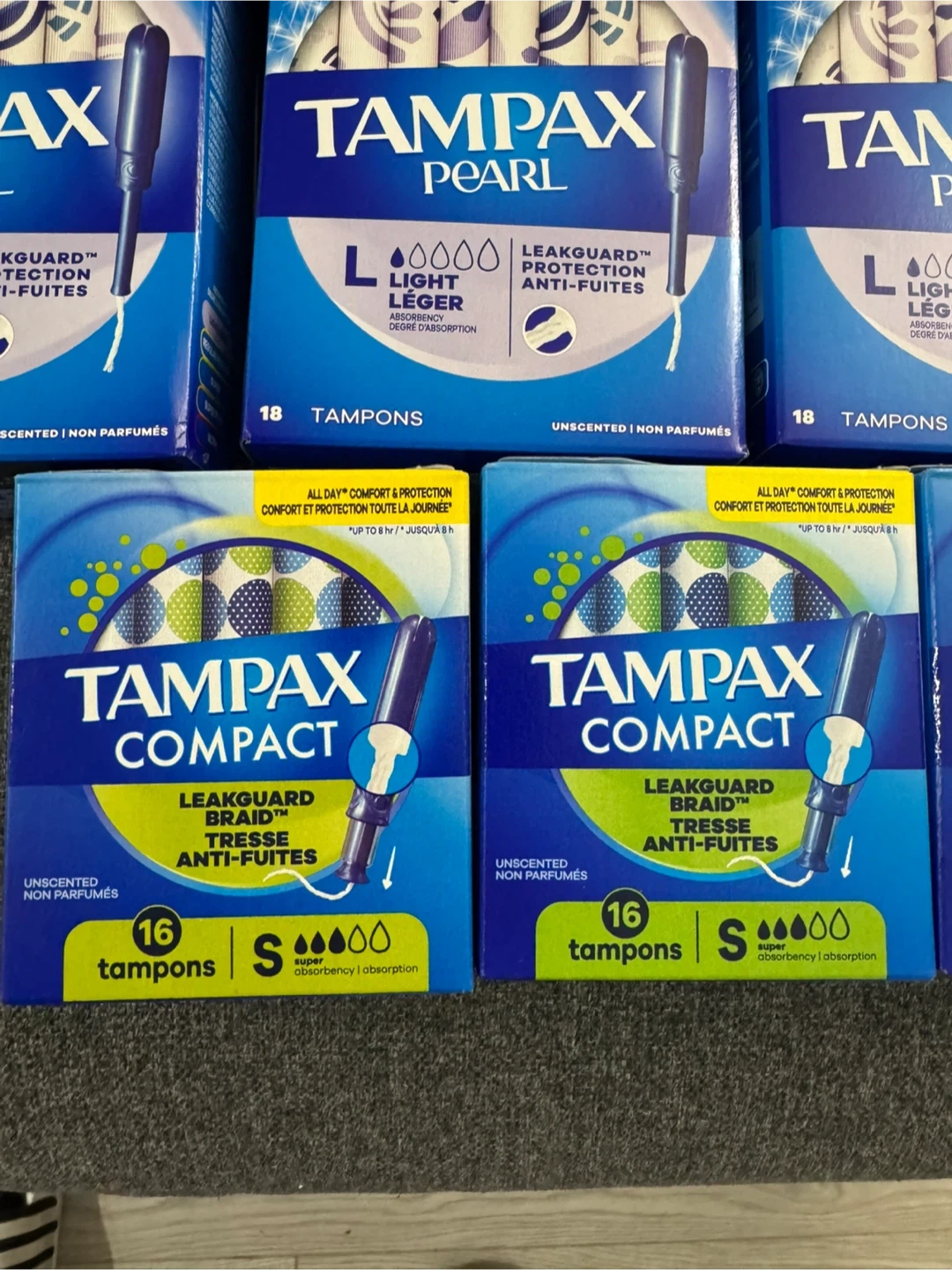 A collection of Tampax Pearl and Tampax Compact tampons. Includes Regular, Super, Light, and Ultra absorbencies. All are unscented and come in packs of 16 or 18.