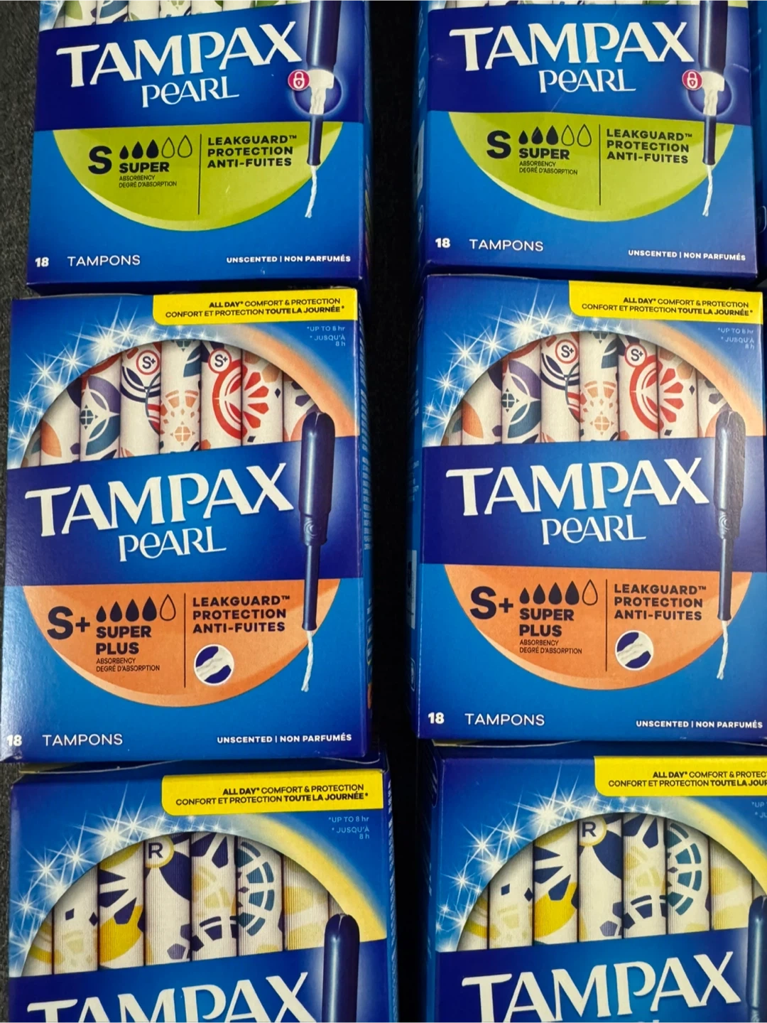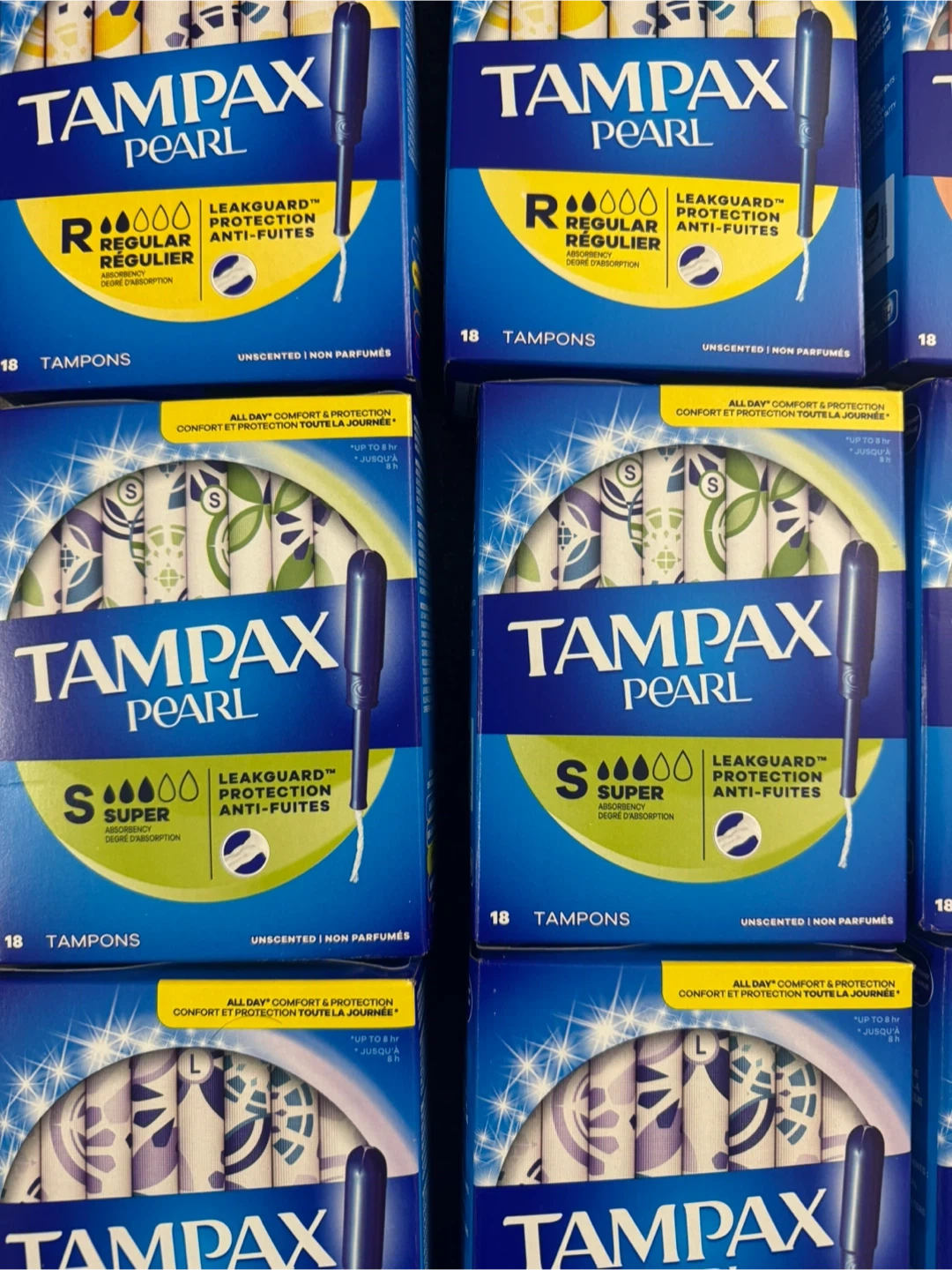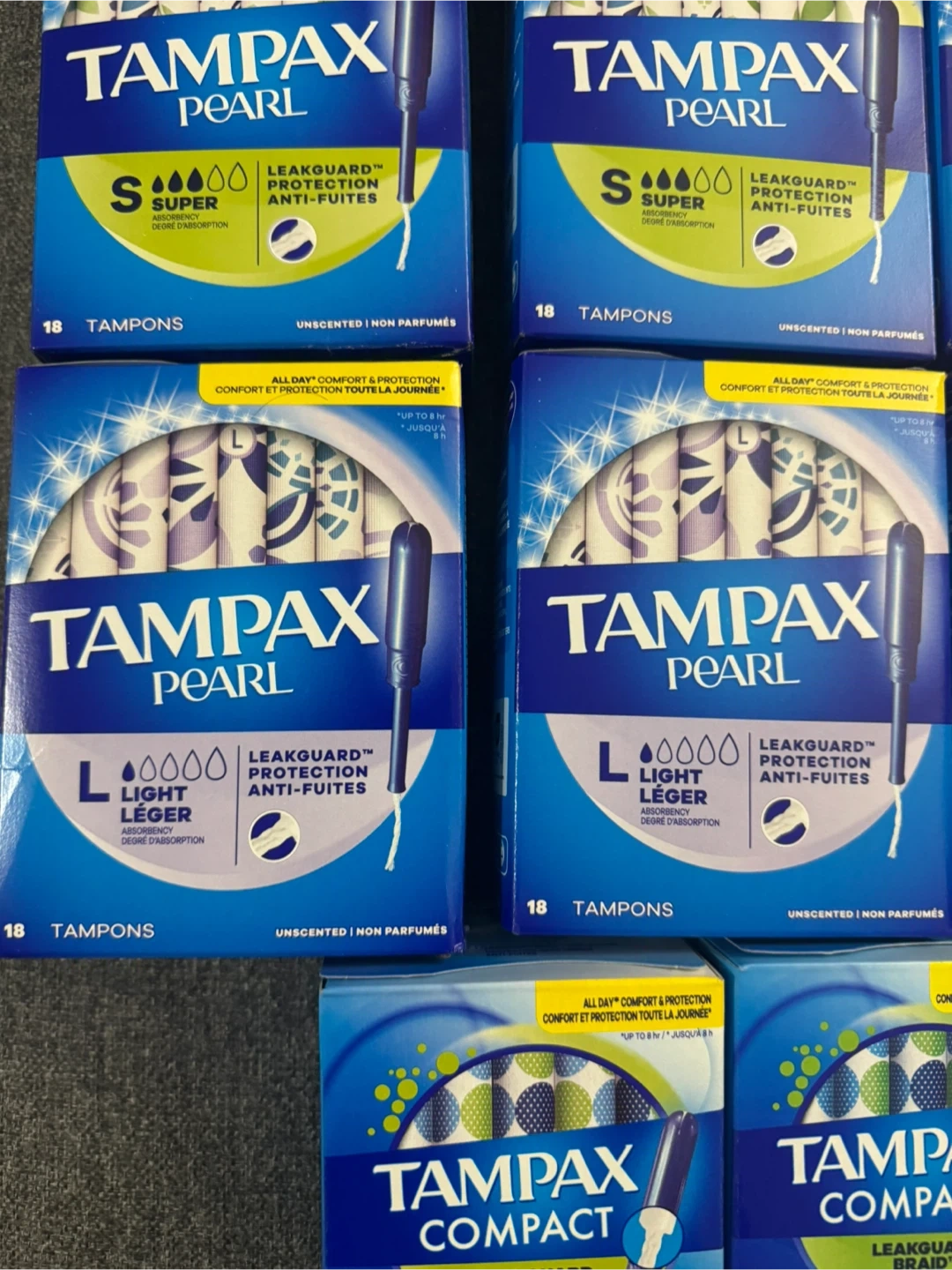 A collection of Tampax Pearl and Tampax Compact tampons. Includes Regular, Super, Light, and Ultra absorbencies. All are unscented and come in packs of 16 or 18.