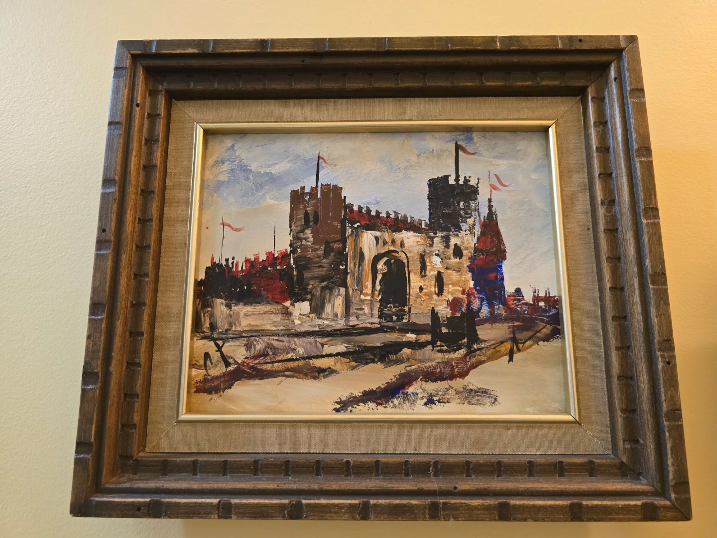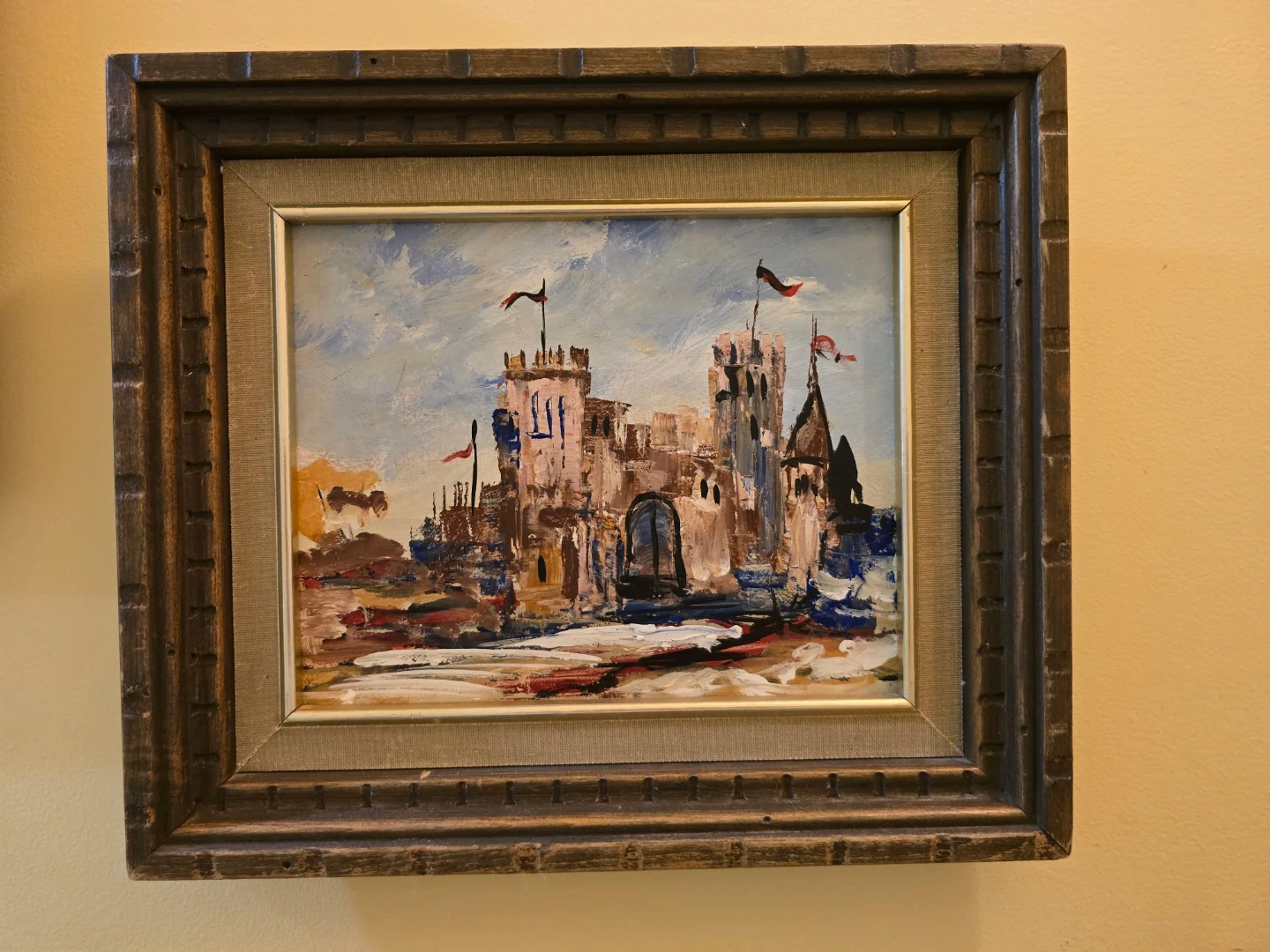 This is an oil painting of a castle, framed and ready to hang. The artwork depicts a medieval-style castle under a cloudy sky with flags. It's a decorative piece for any living room or bedroom. There are 2 matching paintings for sale. Price is $40 per painting or $80 for the 2 paintings.