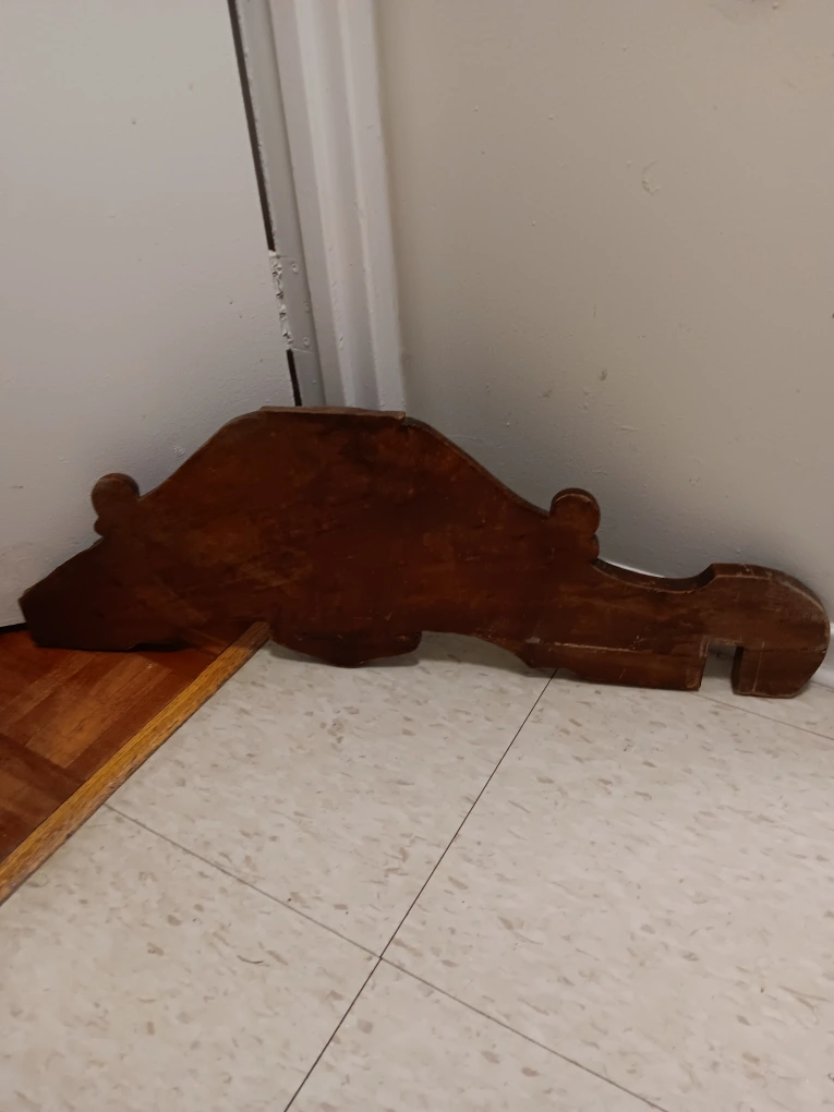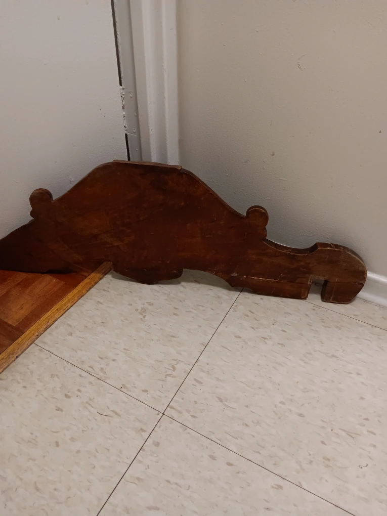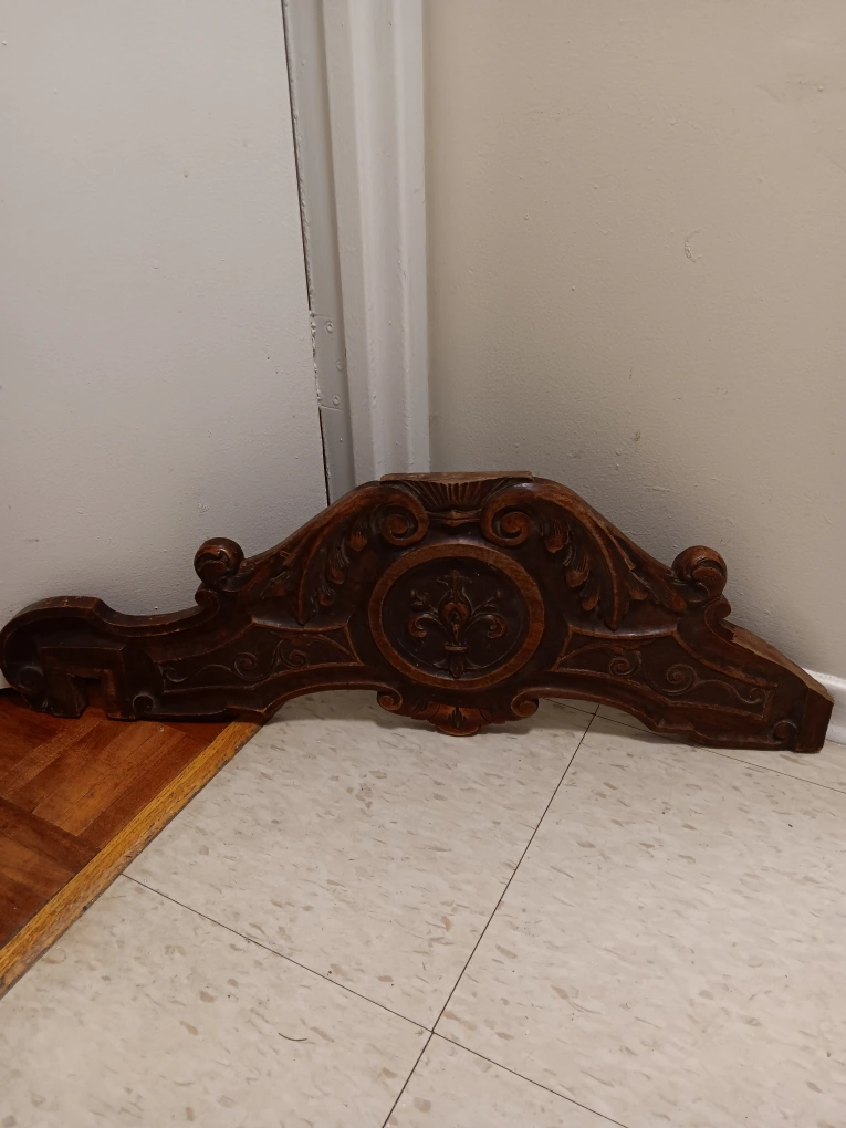 Ornate wooden corner bracket. Intricate carvings. Dark brown finish. Shows some wear. Great for restoration or crafting projects.