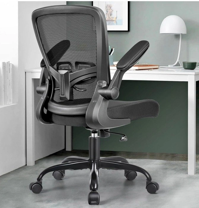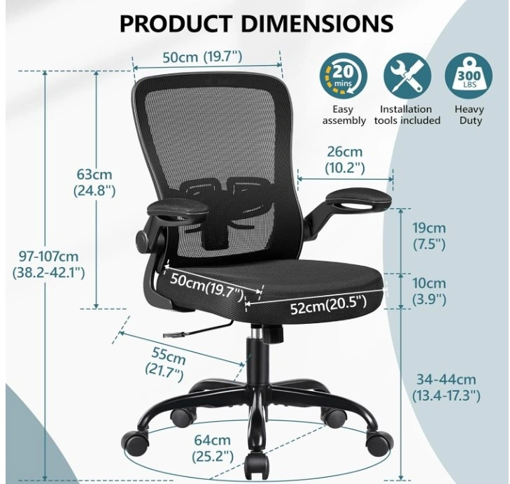 Minlove ergonomic office chair. Features adjustable lumbar support and height, 90° flip-up armrests for easy storage under desks, and a breathable mesh back. The seat cushion is thick and comfortable, suitable for extended use. Smooth 360° swivel wheels. Max weight capacity is 300 lbs. Easy to assemble in about 15 minutes with included tools and manual. Feel free to message if you have any questions!