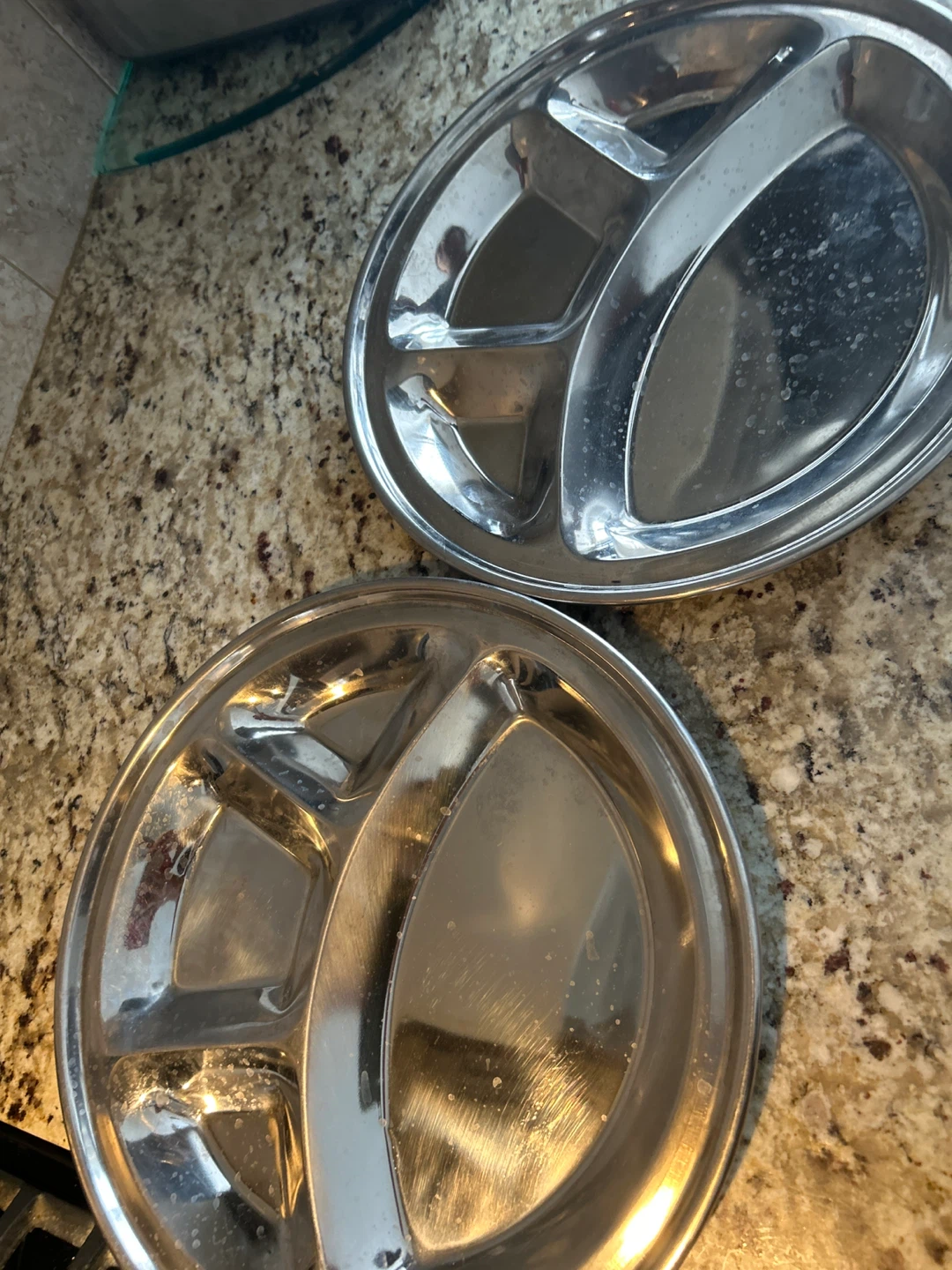 Selling two stainless steel thali plates. They have three compartments each. Great for serving meals with multiple dishes.