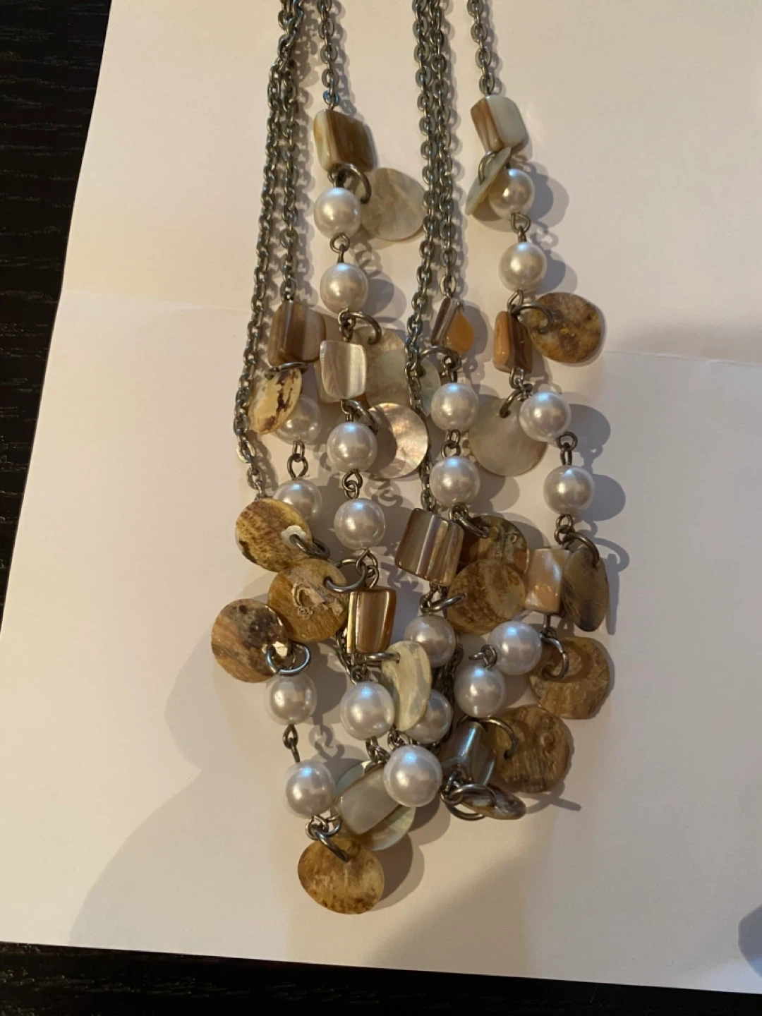 Here's a lovely jewelry set that includes a necklace, bracelet, and earrings! The set features a combination of faux pearls and shell-like accents, adding a touch of elegance and natural beauty to your look
