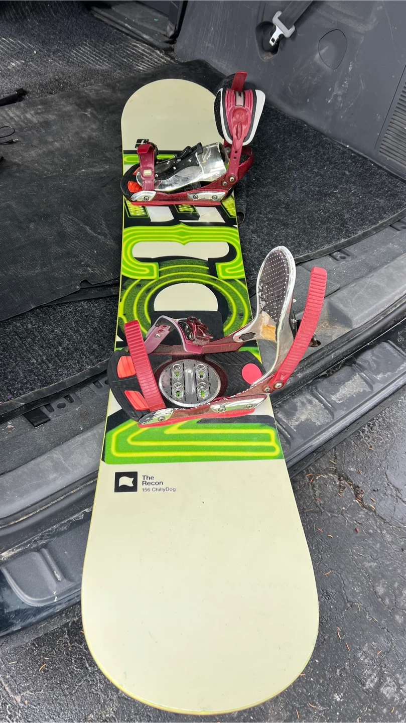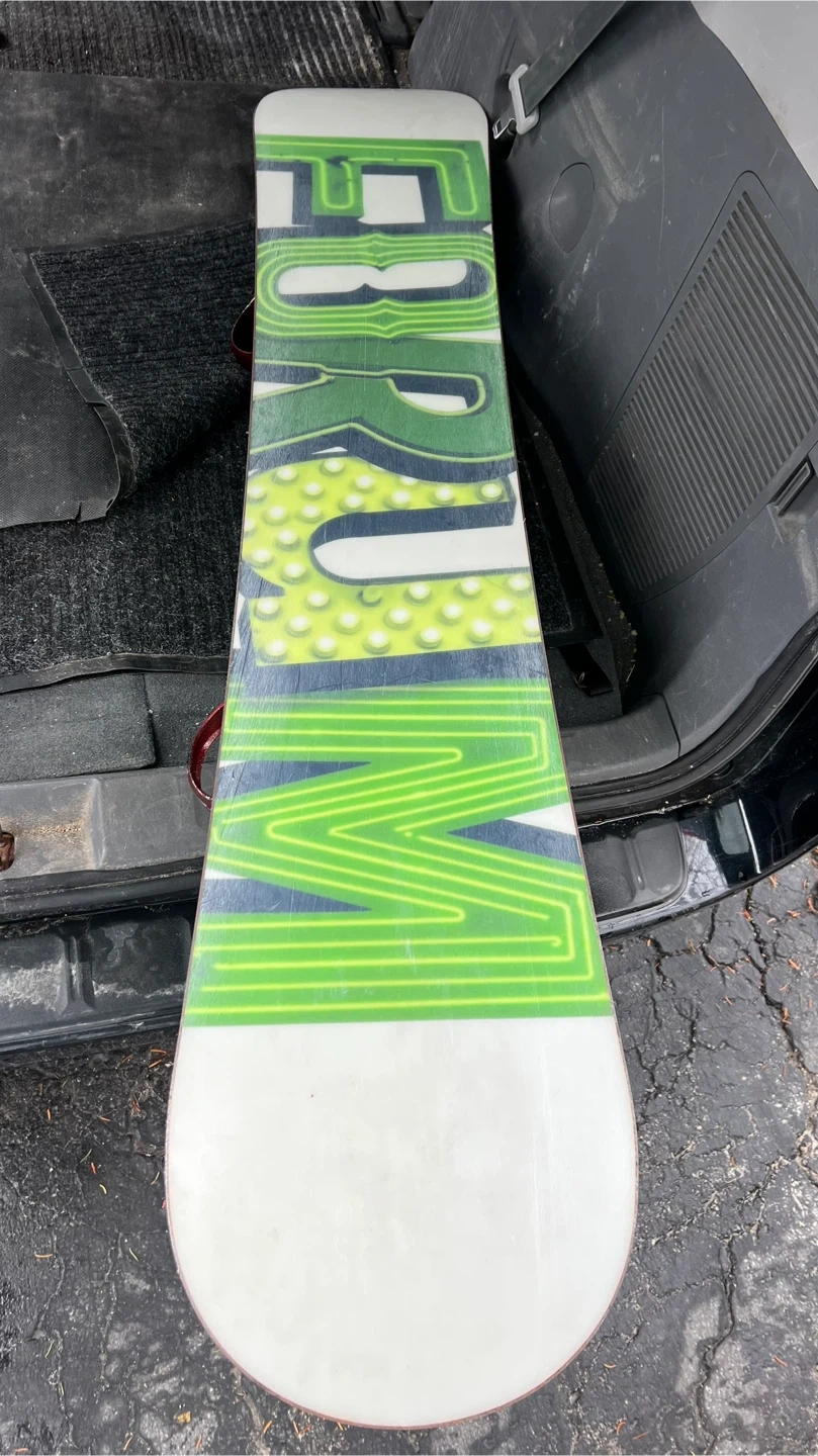 This is a Forum The Recon snowboard with bindings. The board is 156 cm long. It features a bright green and white design. Ready for the slopes!