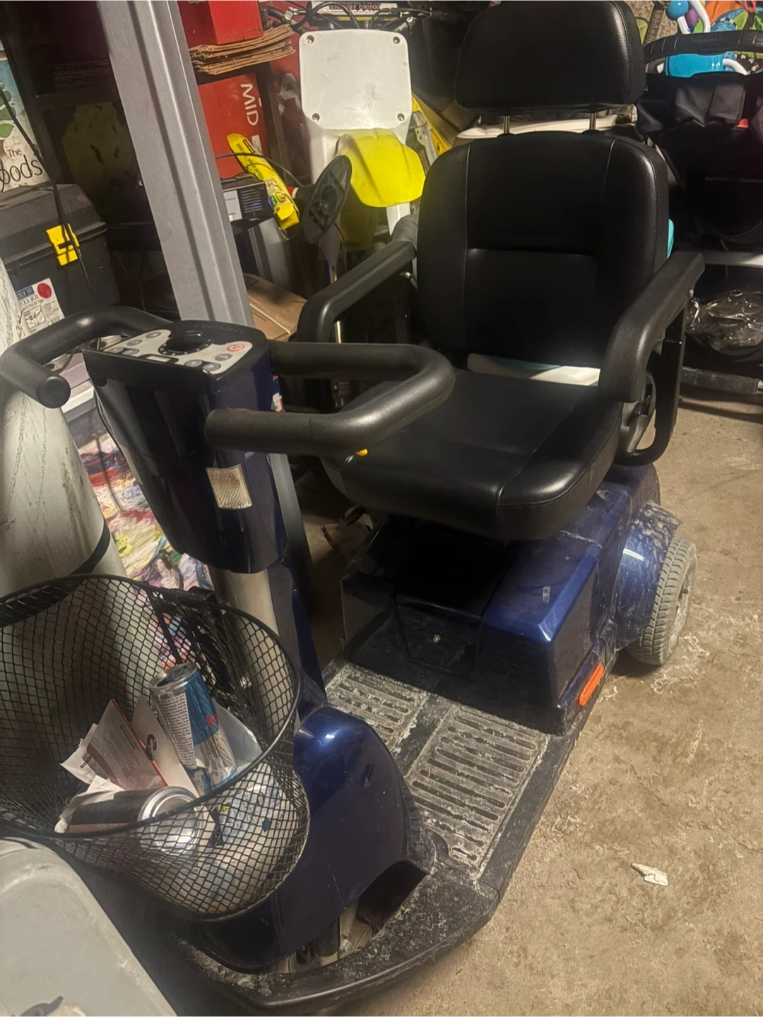 This is a pre-owned mobility scooter, ideal for personal transportation needs. It features a comfortable seat and adjustable controls for ease of use. Included is a front basket for convenient storage.