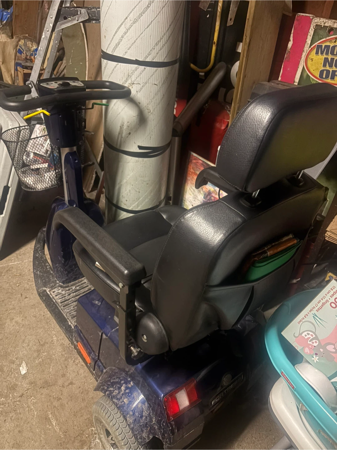 This is a pre-owned mobility scooter, ideal for personal transportation needs. It features a comfortable seat and adjustable controls for ease of use. Included is a front basket for convenient storage.