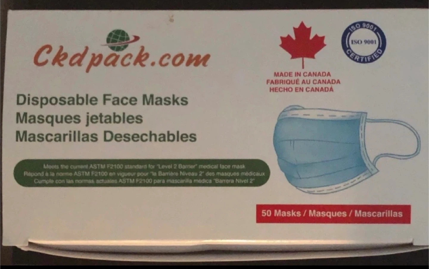 Disposable face masks made in Canada. Meets the current ASTM F2100 standard for "Level 2 Barrier" medical face masks. ISO 9001 certified. 50 masks per box.