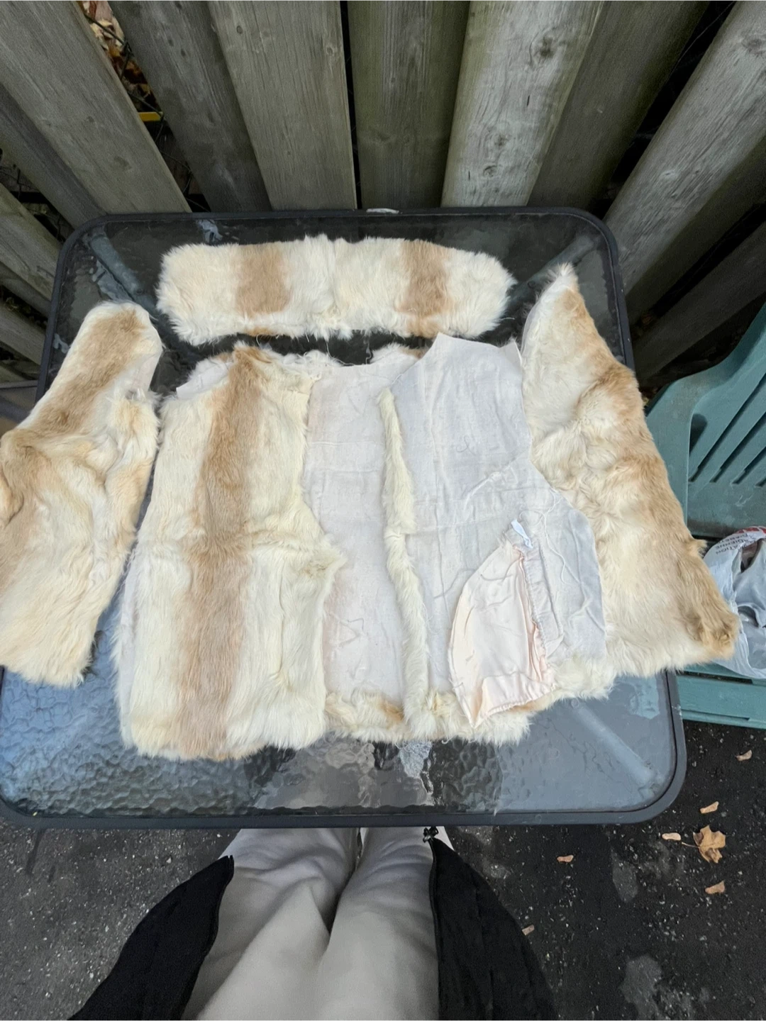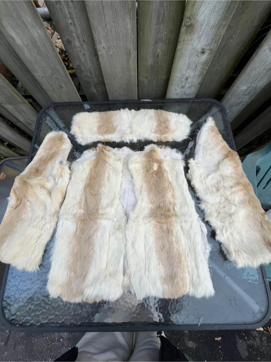 96Selling a beige and brown fur vest DIY kit. It appears to be in new condition and includes several pieces to assemble your own vest. Perfect for a crafty project!