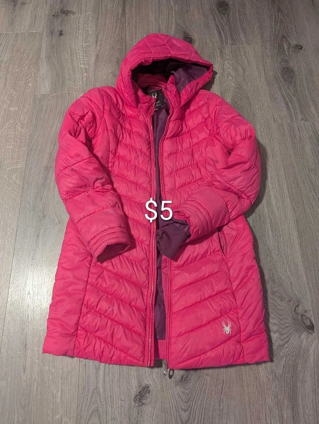 Selling two used girls winter jackets. One is a black hooded puffer jacket and the other is a pink Spyder jacket. Both are in good condition. If this ad is still up, then they are still available!