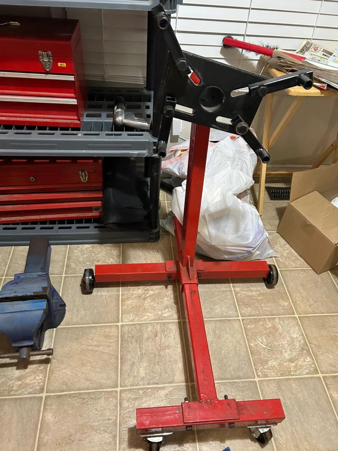 This is a red engine hoist stand with a metal construction. It's on wheels for easy movement. This stand is useful for auto repair projects.