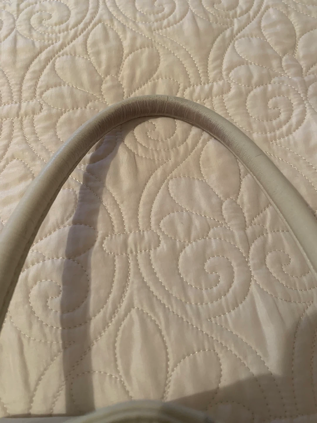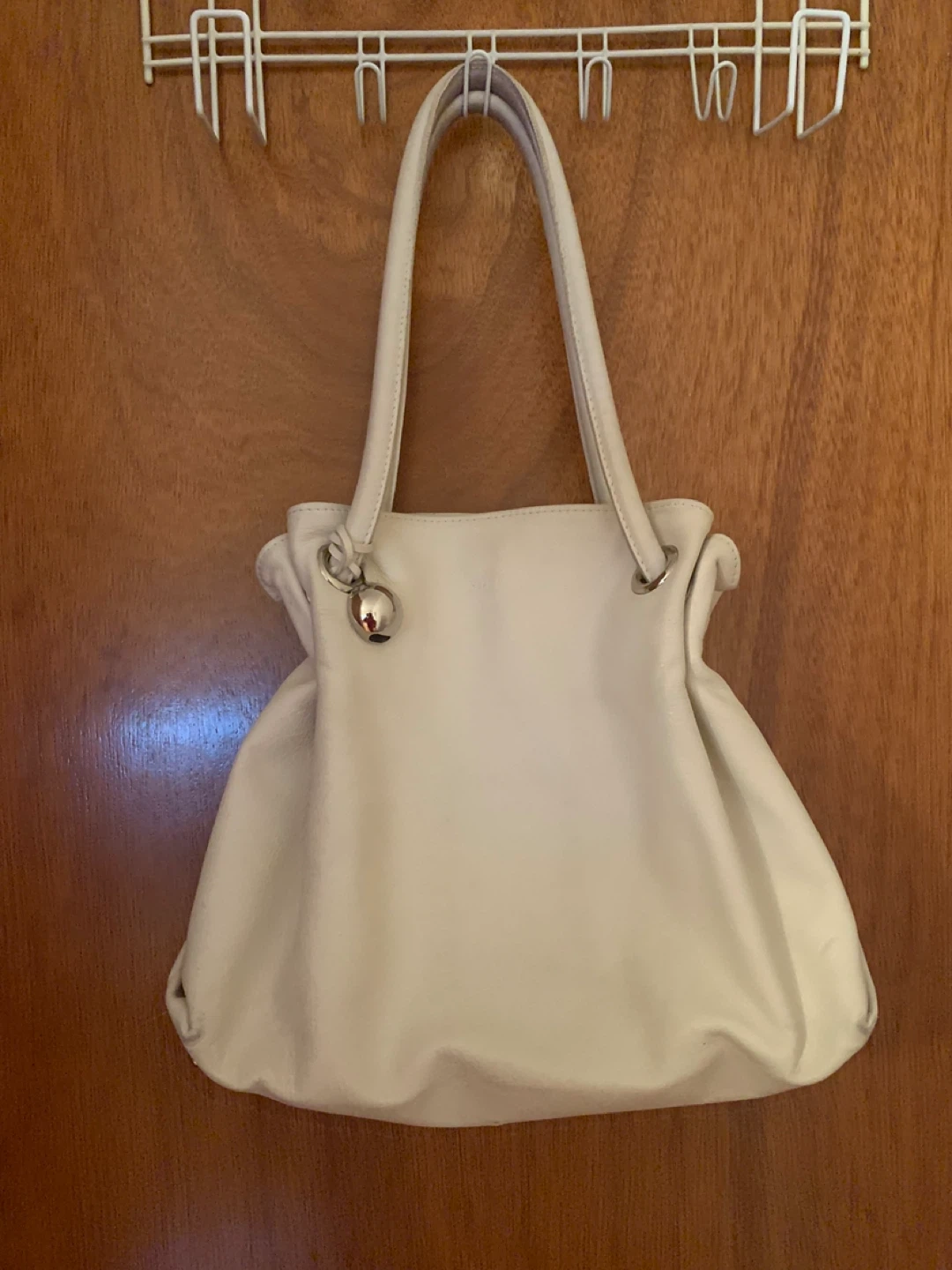10Selling a cute cream-coloured leather shoulder bag. It has a drawstring closure and a small exterior pocket. It's in good condition with a few minor marks as pictured