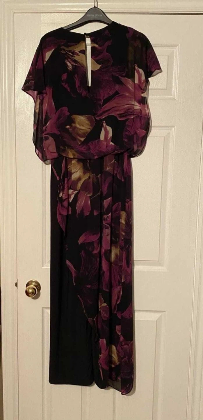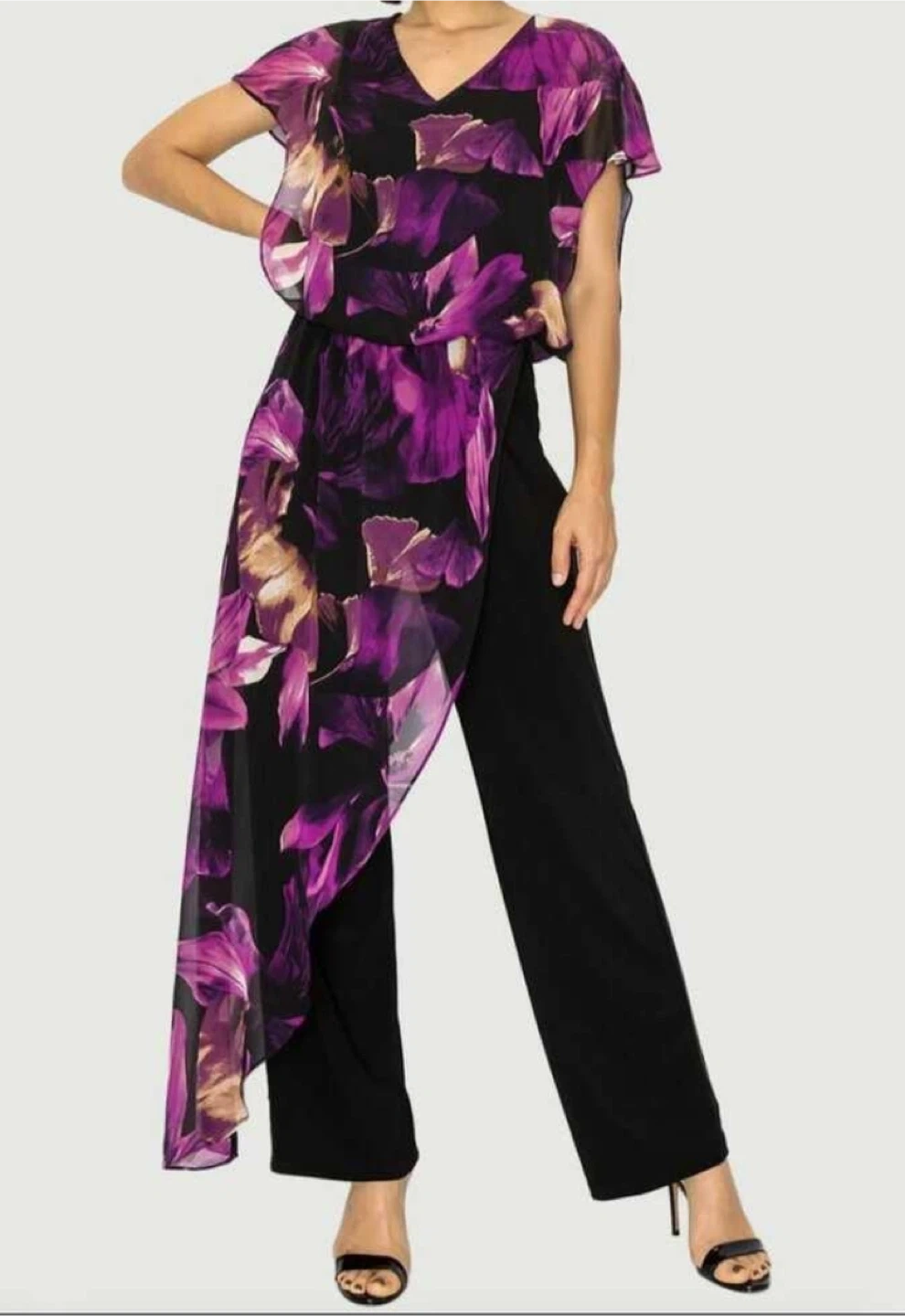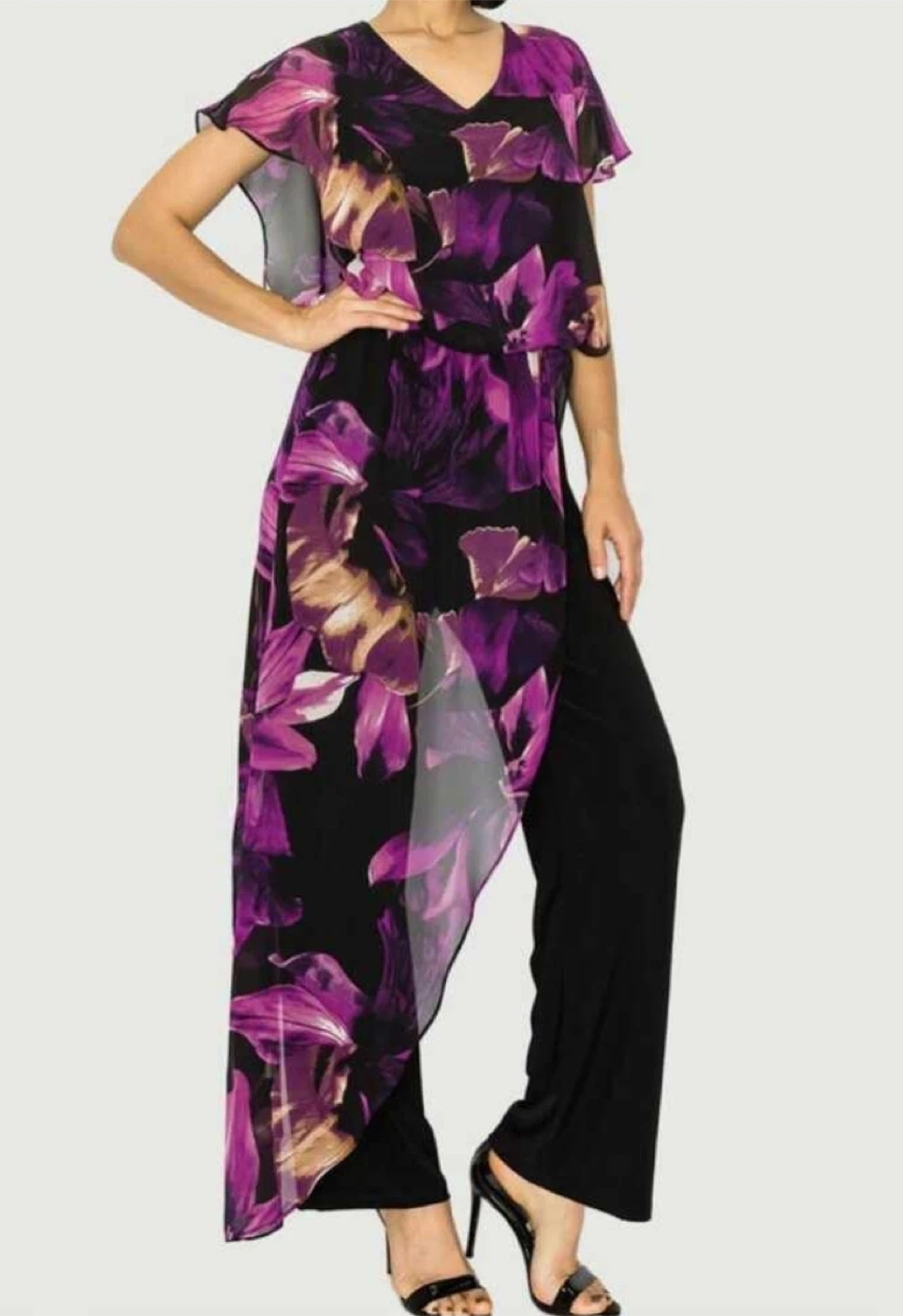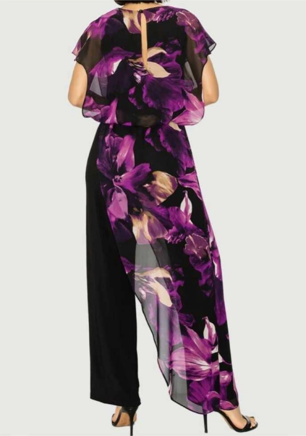Formal black jumpsuit featuring a colourful chiffon floral print overlay. It has wide legs and short flutter sleeves. This piece is perfect for a special occasion or evening wear!