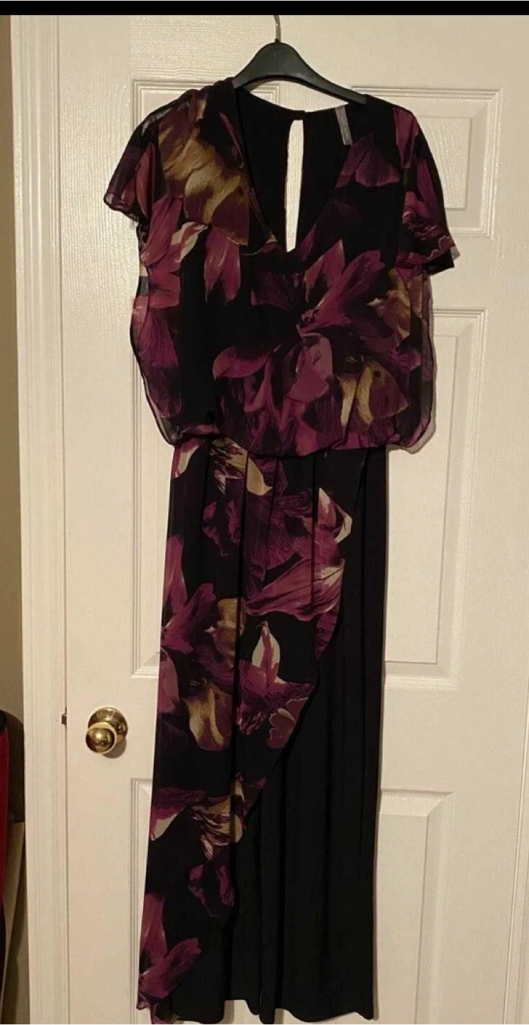 Formal black jumpsuit featuring a colourful chiffon floral print overlay. It has wide legs and short flutter sleeves. This piece is perfect for a special occasion or evening wear!