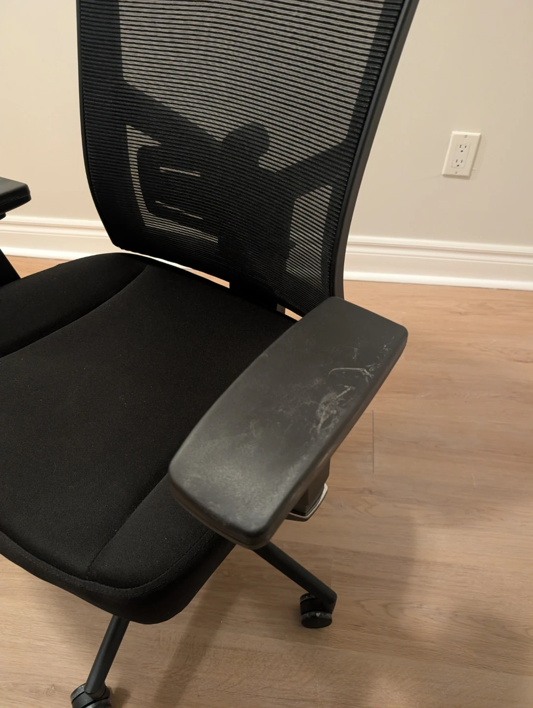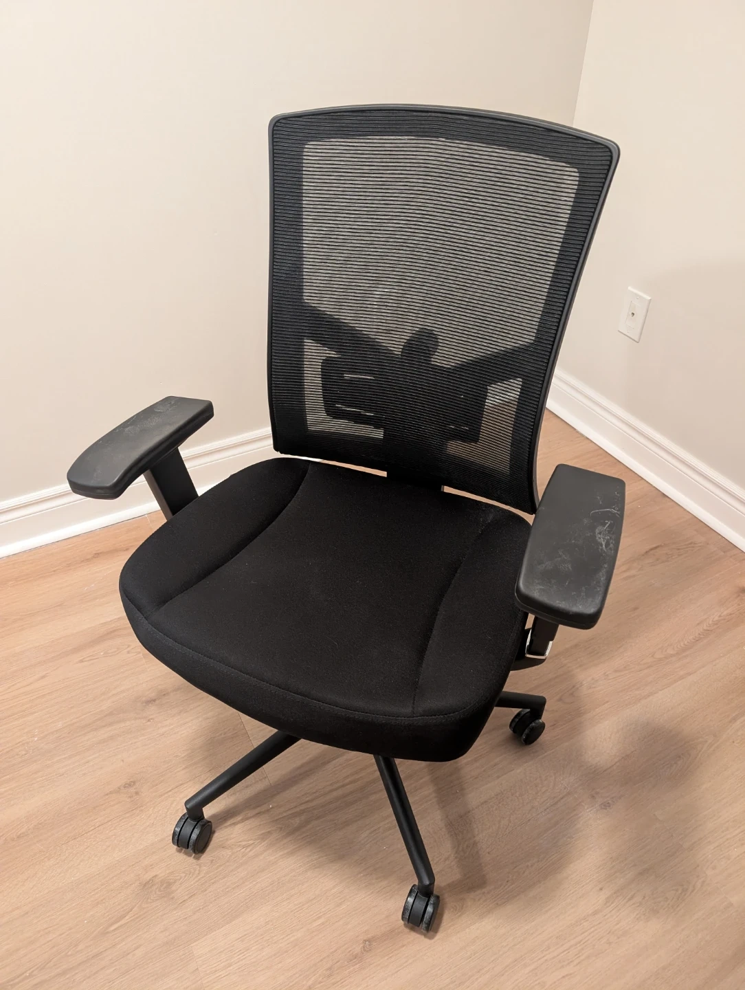 Selling a comfortable black office chair! It features a breathable mesh back and adjustable armrests for a great ergonomic experience. There are some signs of wear on the armrests, but otherwise it's in good condition and ready for a new home