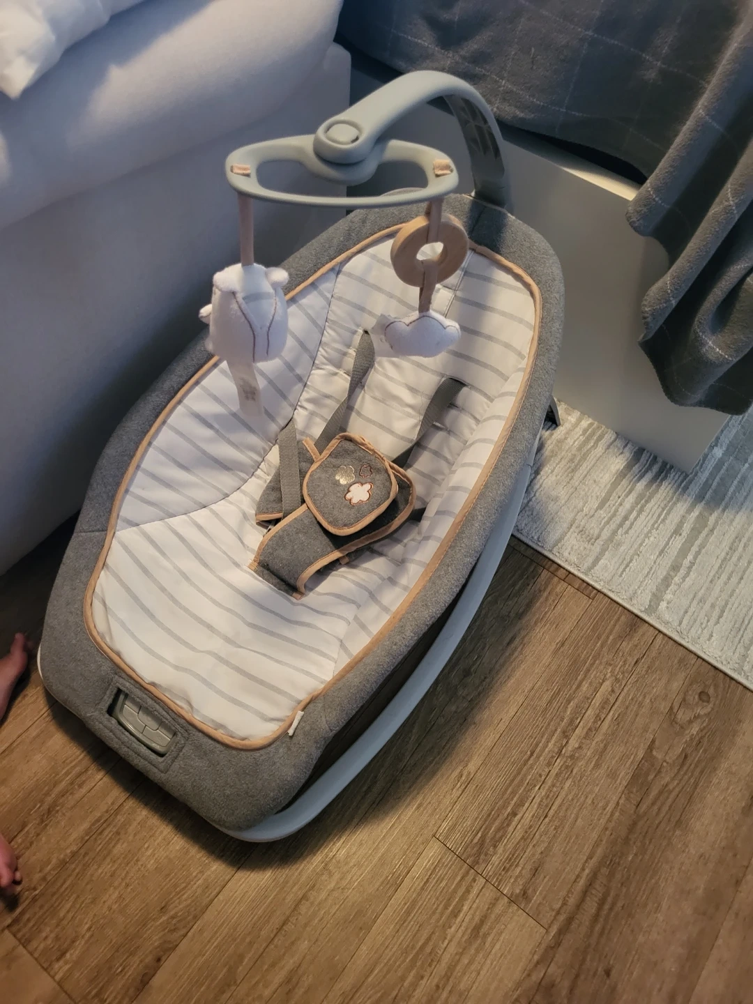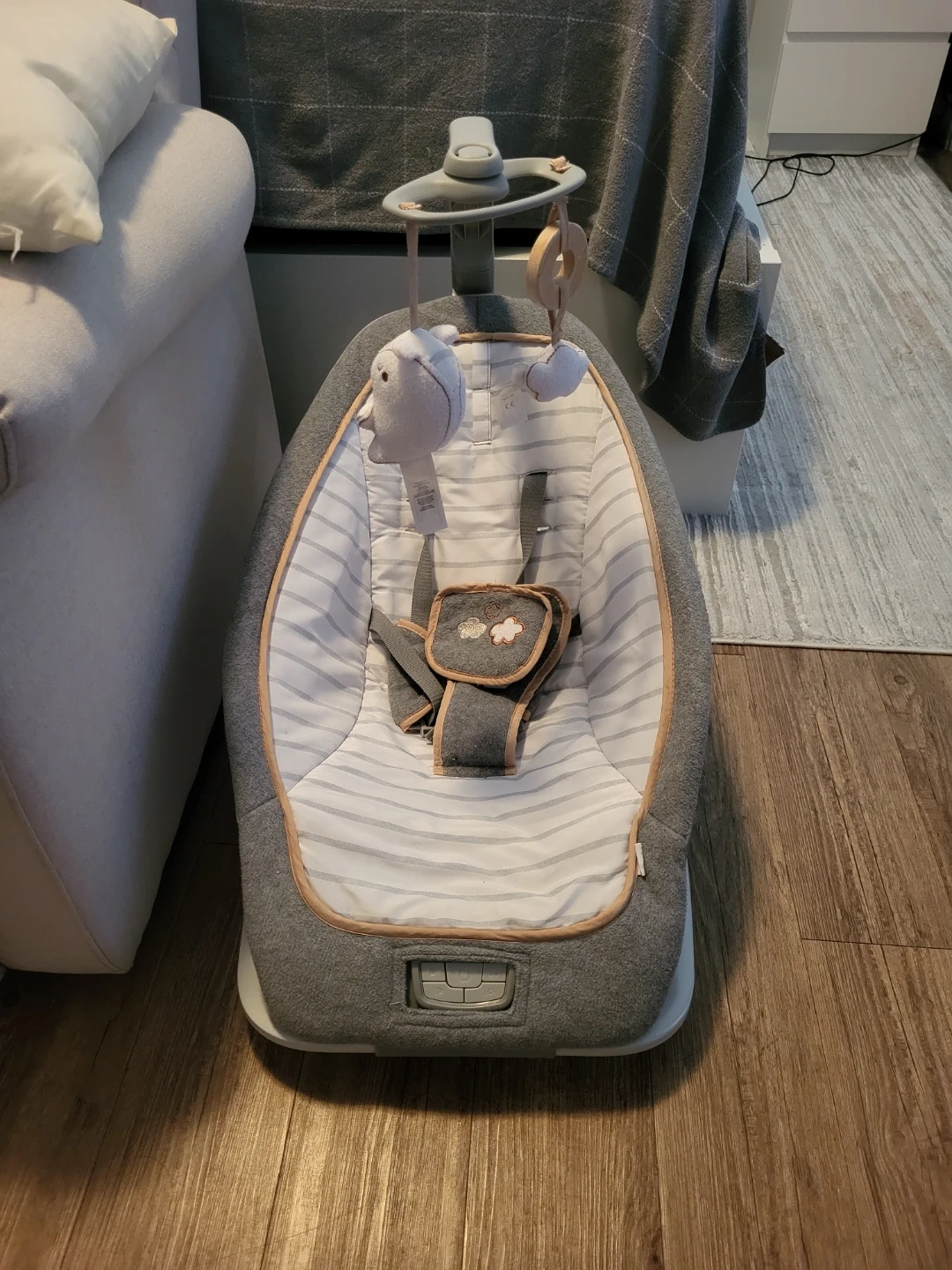 Grey and white striped baby rocker seat. It has a removable toy bar with plush toys. The seat features a secure harness for safety. It's a comfy spot for baby to relax.