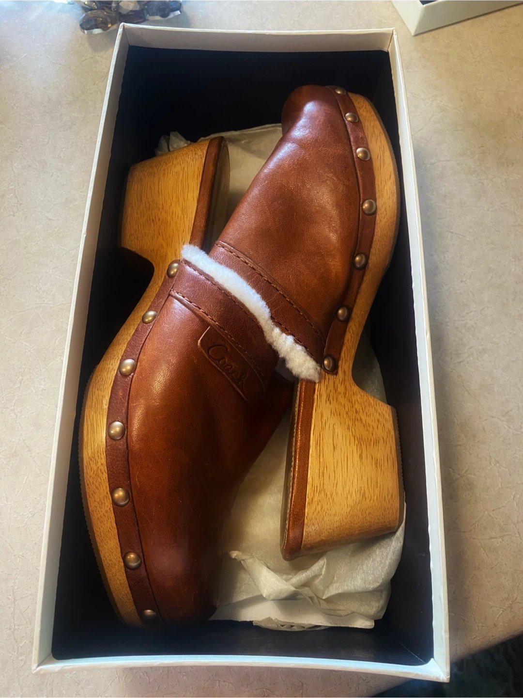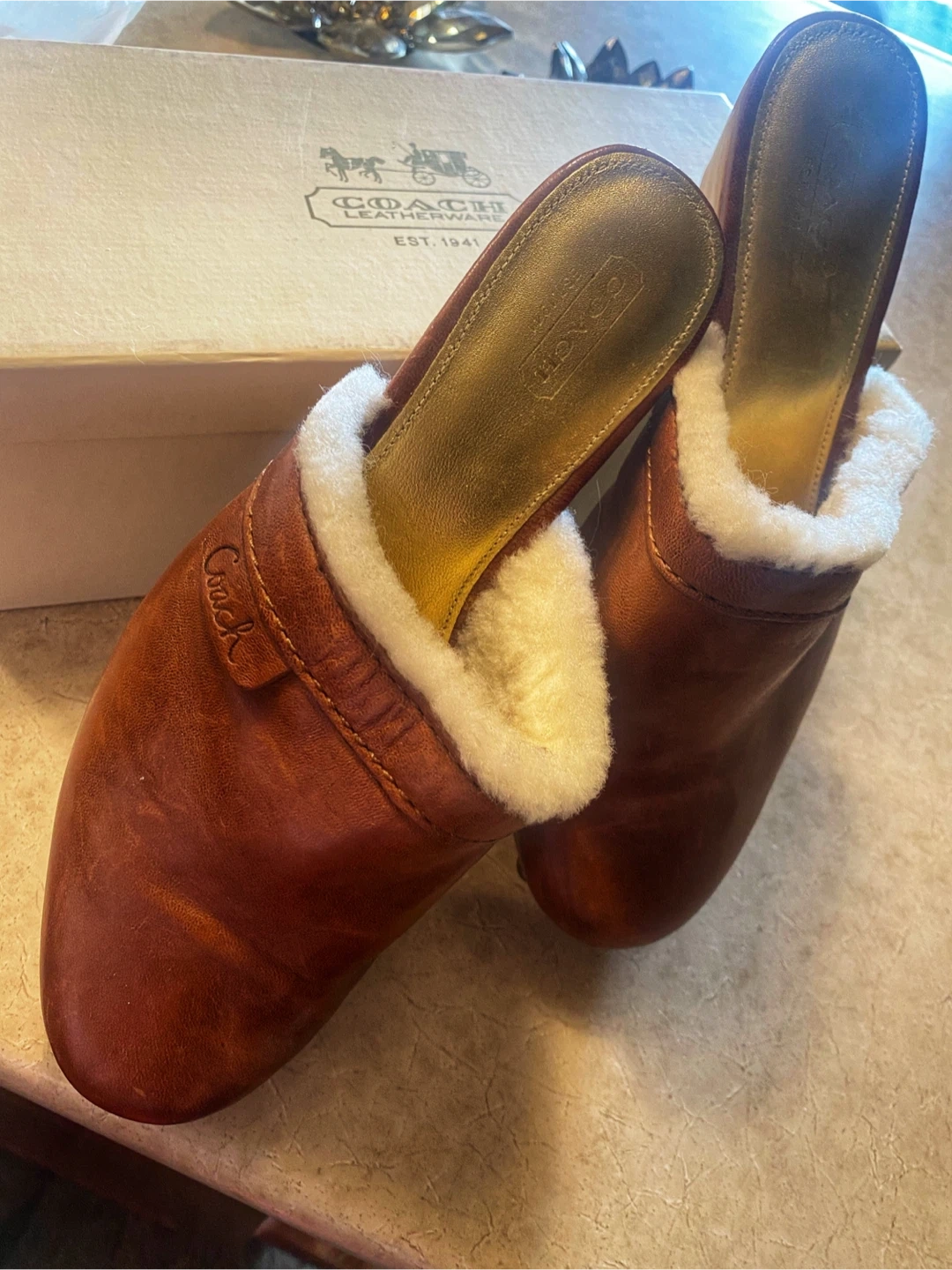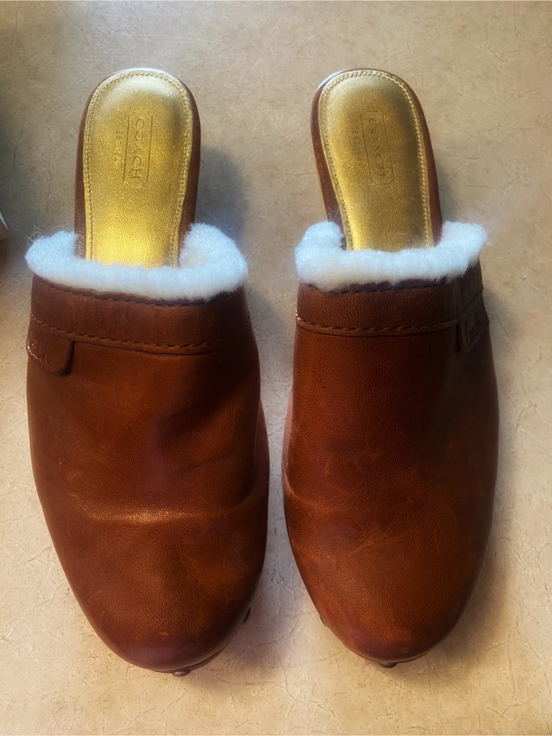 Buy & Sell🤎Coach Brown Leather & Shearling Clogs🤎Coach Brown Leather & Shearling Clogs$73🤎Coach brown leather clogs with cozy shearling lining. These clogs feature a wooden sole and brass stud accents. They come in Coach box.🤎Size 9ConditionNewTalla9BrandCoachWHERE TO MEETDundarave Beach West VancouverView MapSELLERverifiedEvelynDundarave Beach721 review0 chats·0 favorites·10 viewsSEND CHAT TO SELLERHi Evelyn! I’m interested in your listing.Hi Evelyn! I’m interested in your listing.Get the Karrot app to chatSign In to chat