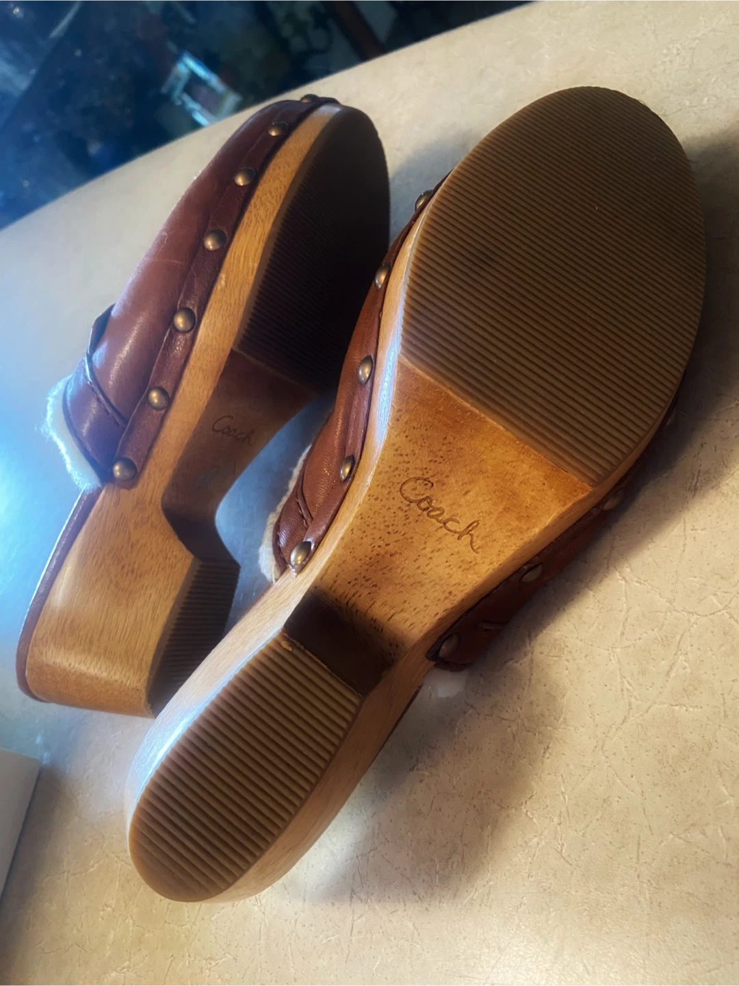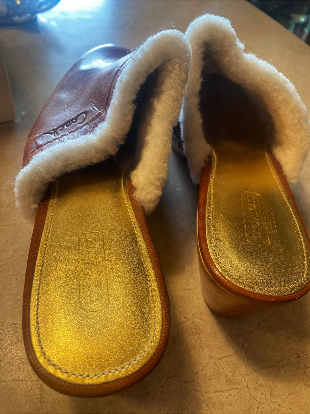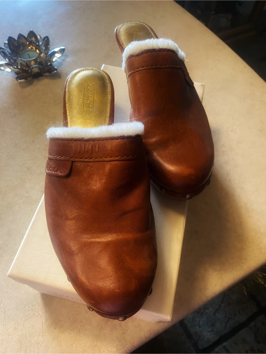 Buy & Sell🤎Coach Brown Leather & Shearling Clogs🤎Coach Brown Leather & Shearling Clogs$73🤎Coach brown leather clogs with cozy shearling lining. These clogs feature a wooden sole and brass stud accents. They come in Coach box.🤎Size 9ConditionNewTalla9BrandCoachWHERE TO MEETDundarave Beach West VancouverView MapSELLERverifiedEvelynDundarave Beach721 review0 chats·0 favorites·10 viewsSEND CHAT TO SELLERHi Evelyn! I’m interested in your listing.Hi Evelyn! I’m interested in your listing.Get the Karrot app to chatSign In to chat