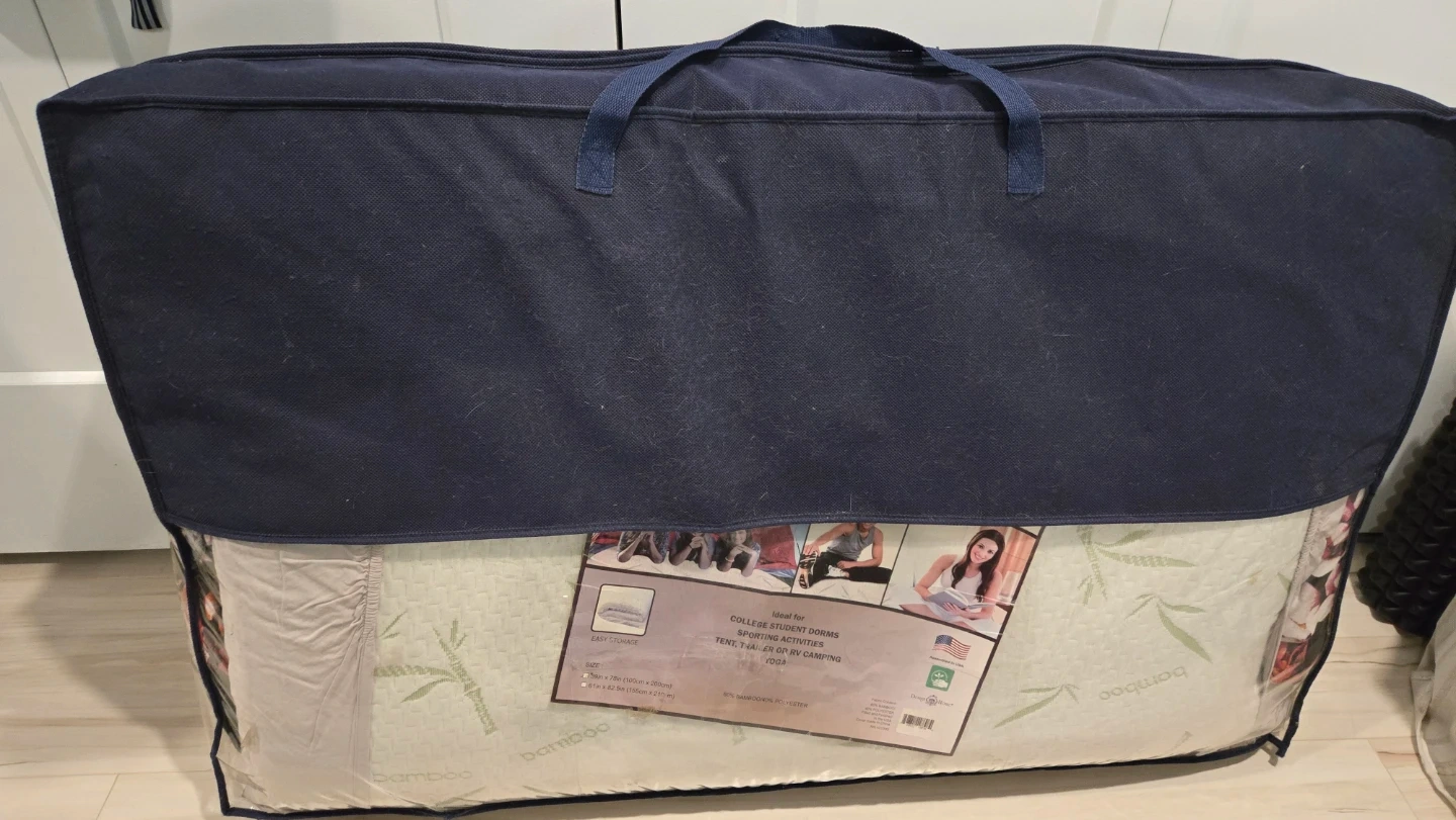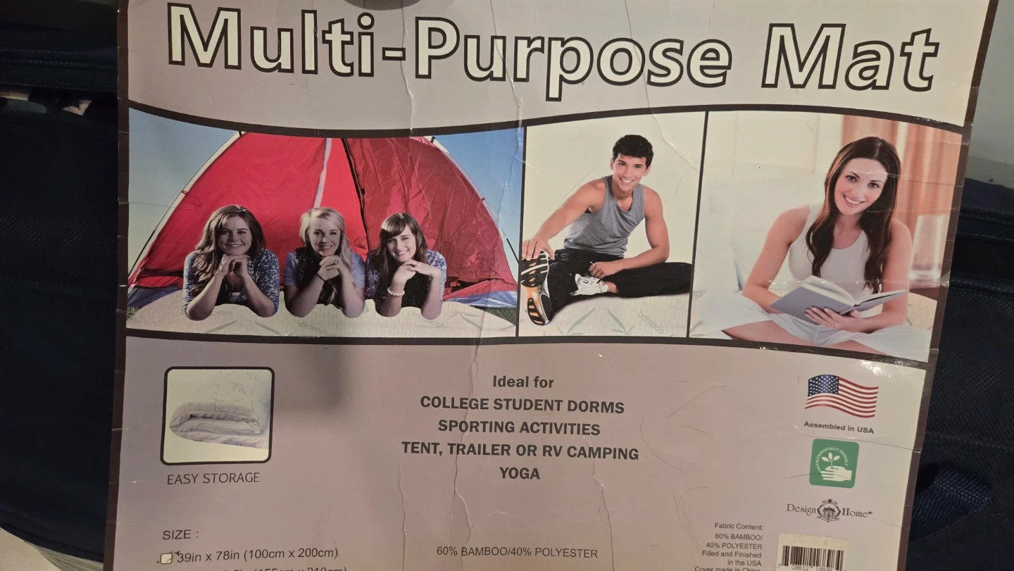 60Selling a Design Home Multi-Purpose Mat, perfect for college student dorms, sporting activities, tent, trailer or RV camping, and yoga! It's easy to store and measures 39 inches by 78 inches (100cm x 200cm). The fabric content is 60% bamboo and 40% polyester. This comes with; - Futon mattress (single sized) - single bed sheet (grey) - single duvet with cover (Ikea light weight and H&M black and pink flower cover). This futon is used for a year before put away in storage room. It has been in this cover for a couple of years. There are some cat hair stuck on the cover, but the linens have been washed before stored away. Pick-up only.