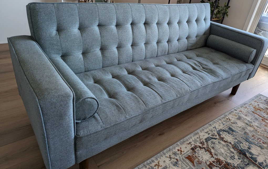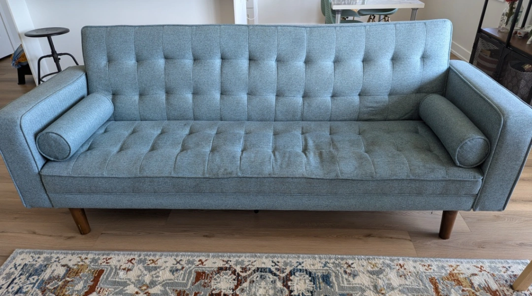 Comfortable and stylish futon sofa bed. Teal/grey fabric. Wooden legs. Includes two bolster pillows. Great for small spaces. https://www.pinterest.com/pin/structube-jean-tufted-sofa-bed-in-mauve--184014334764815490/
