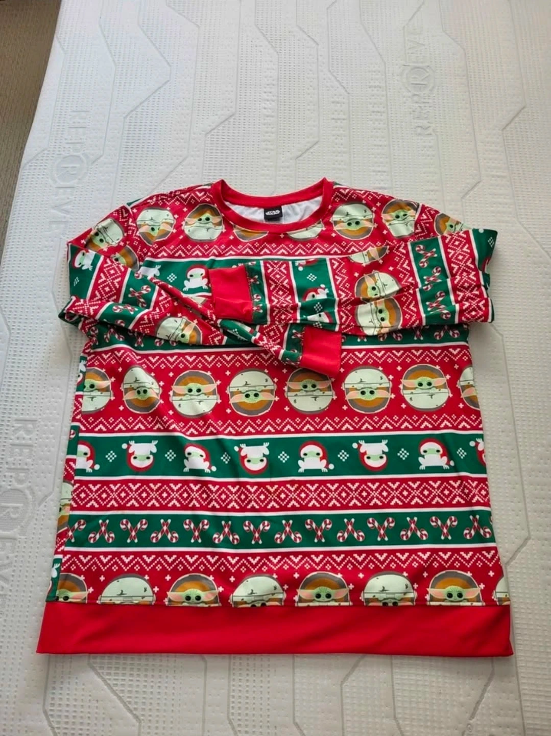 This festive Star Wars sweater features a fun Baby Yoda Christmas print. It's made of 100% polyester and is a size L/G. Wash with like colours.