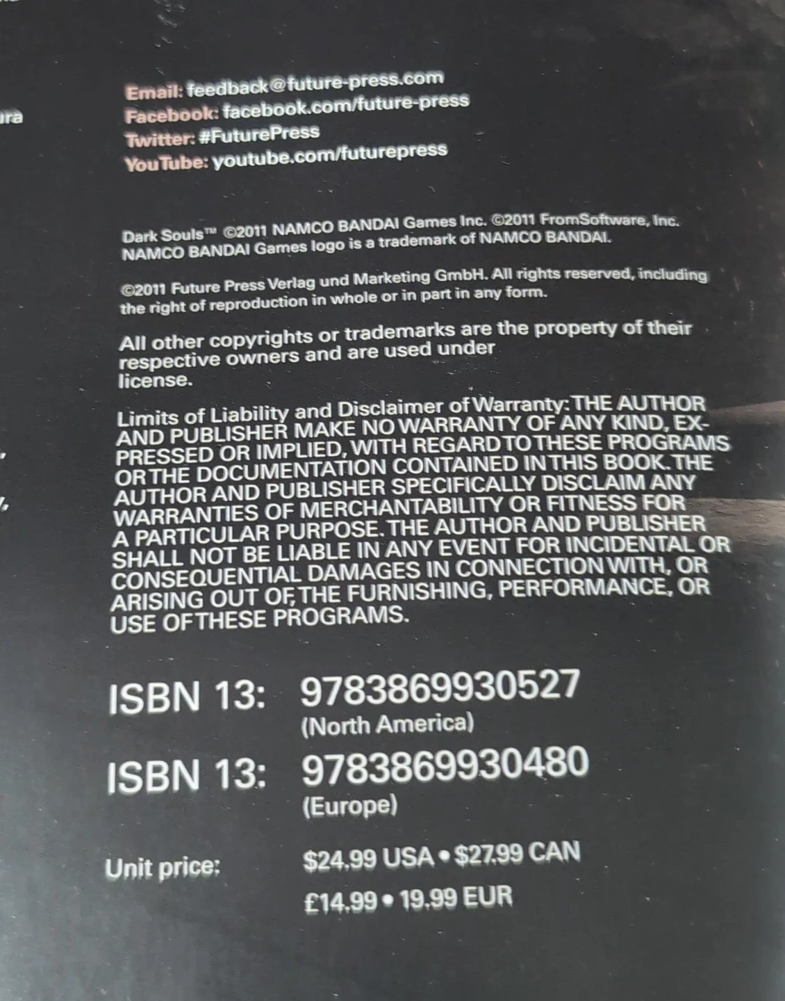 60Selling a Dark Souls strategy guide book. The book includes copyright and trademark information from NAMCO BANDAI Games and Future Press.