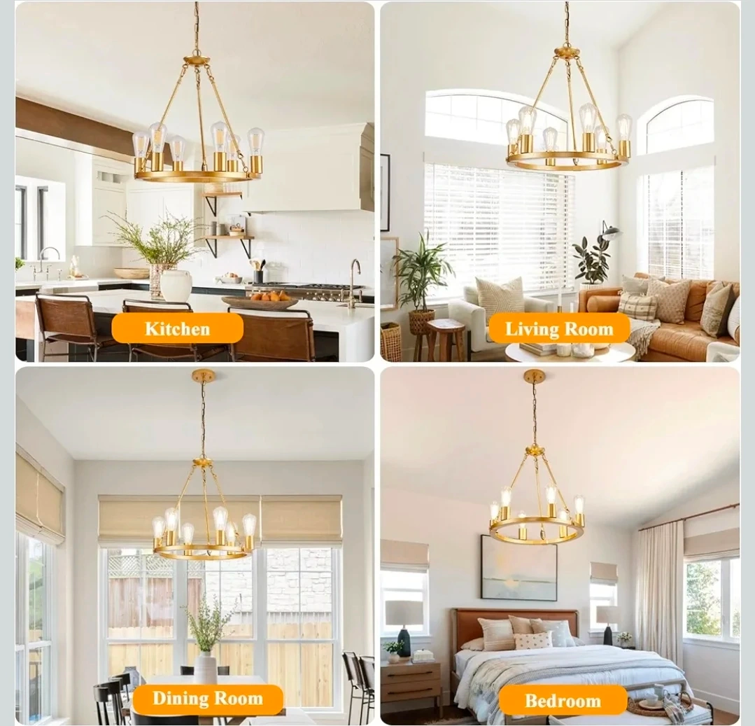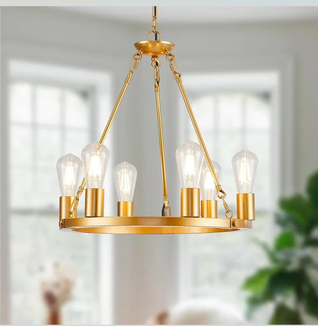 This modern wagon wheel chandelier features a gold finish and six lights. It's height adjustable and compatible with various E26 bulbs. The fixture's design accommodates flat, sloped, and vaulted ceilings.
