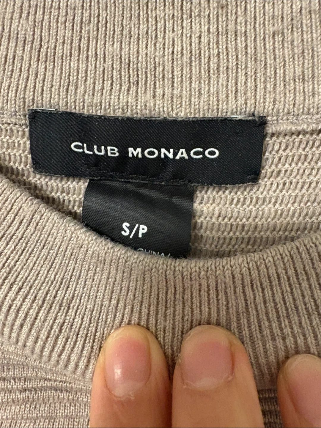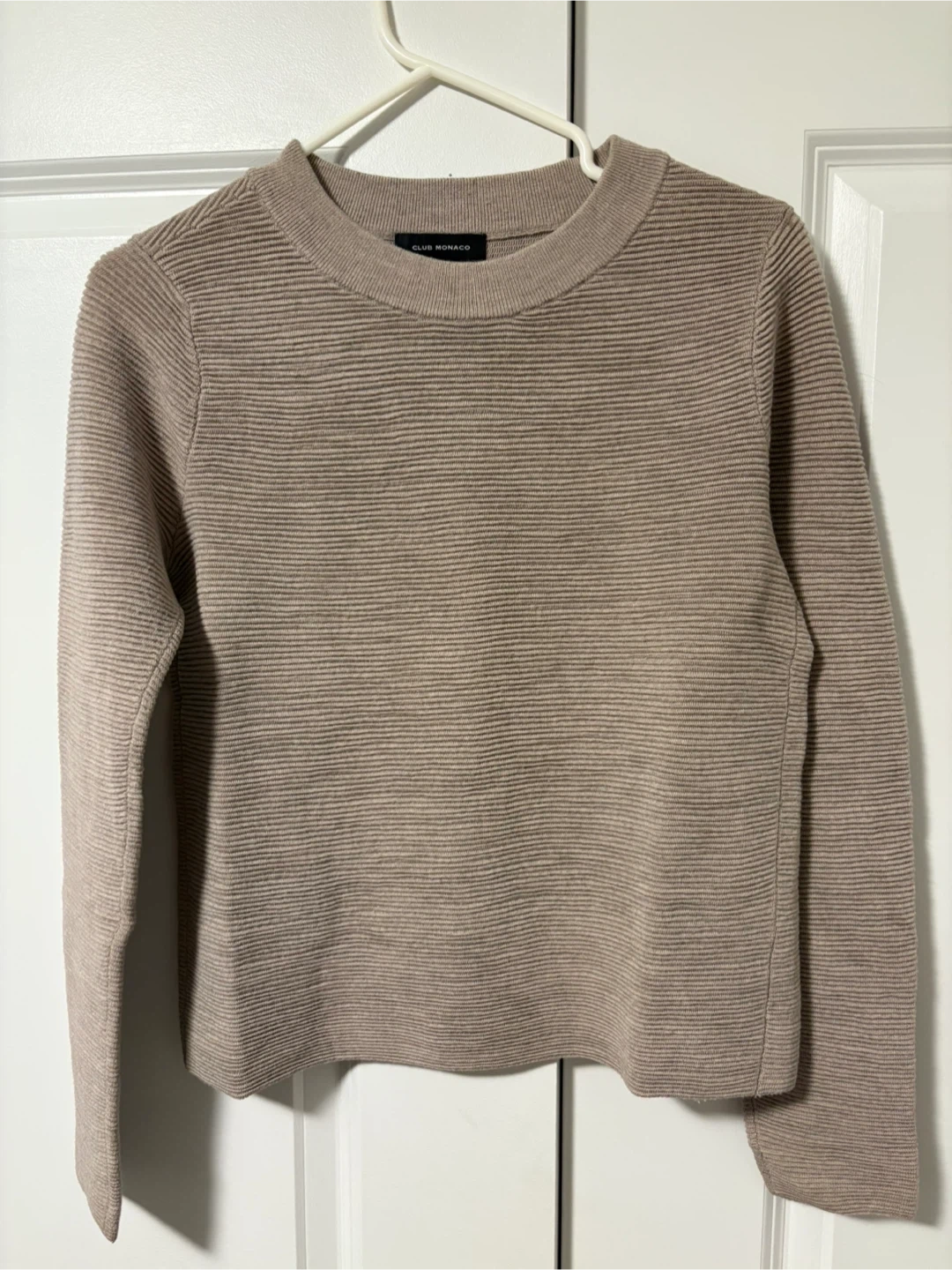 This is a Club Monaco knit sweater in a neutral beige colour. It's a size small/petite with a ribbed texture throughout. Perfect for layering on cooler days!