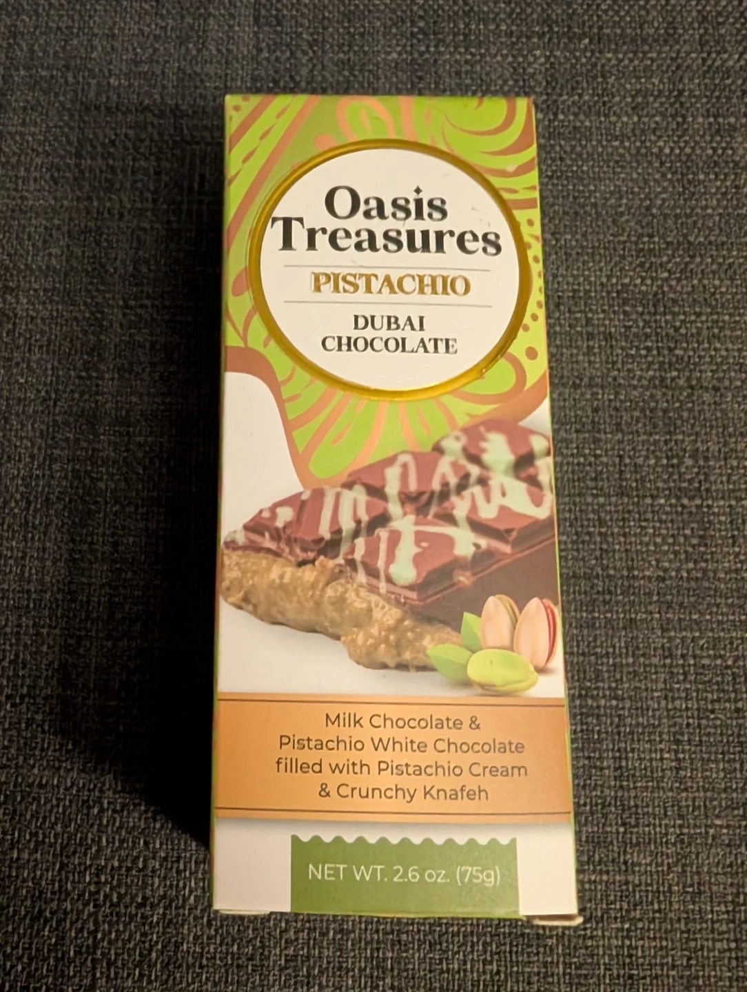 a box of Oasis Treasures Pistachio Dubai Chocolate, it's Milk Chocolate & Pistachio White Chocolate filled with Pistachio Cream & Crunchy Knafeh