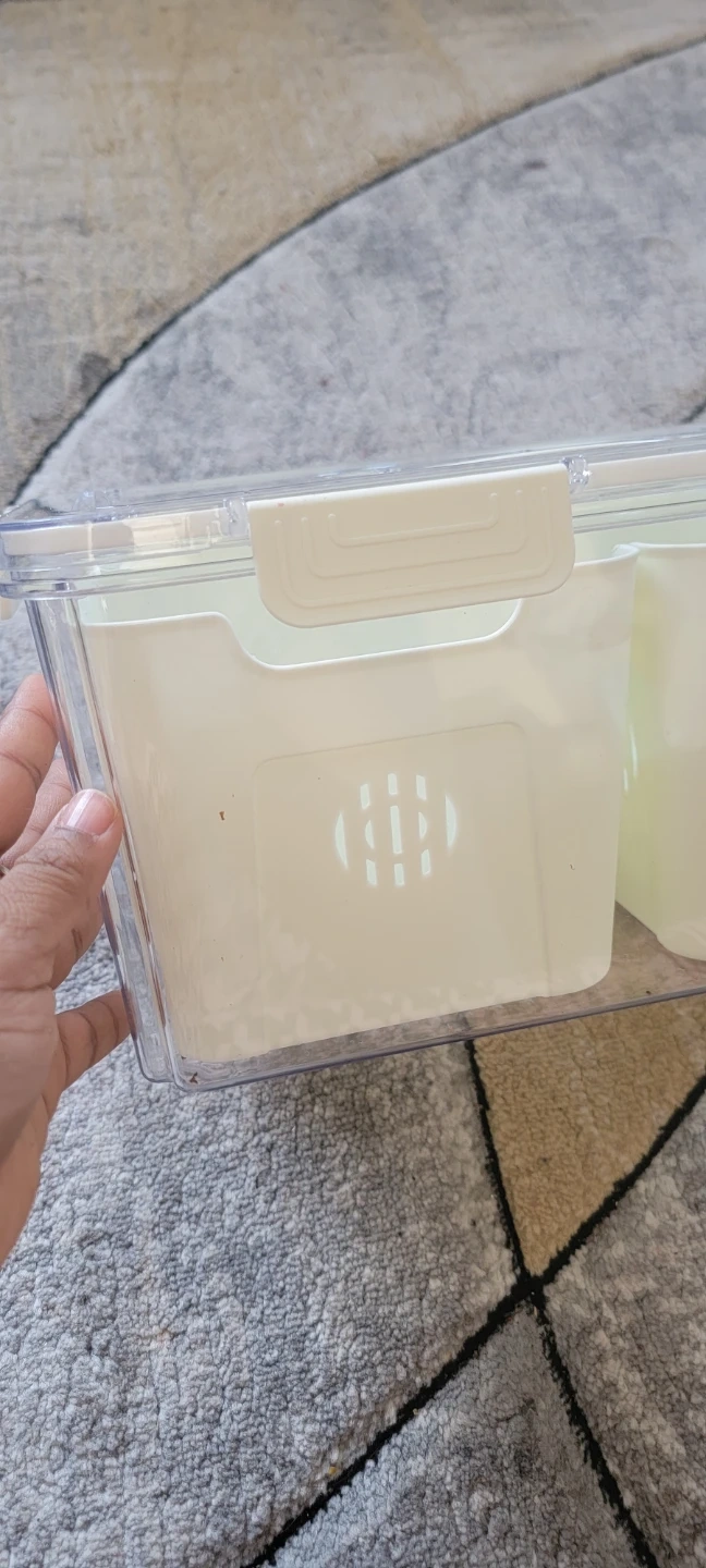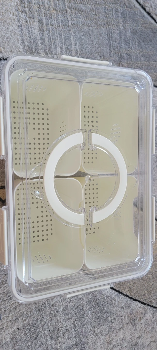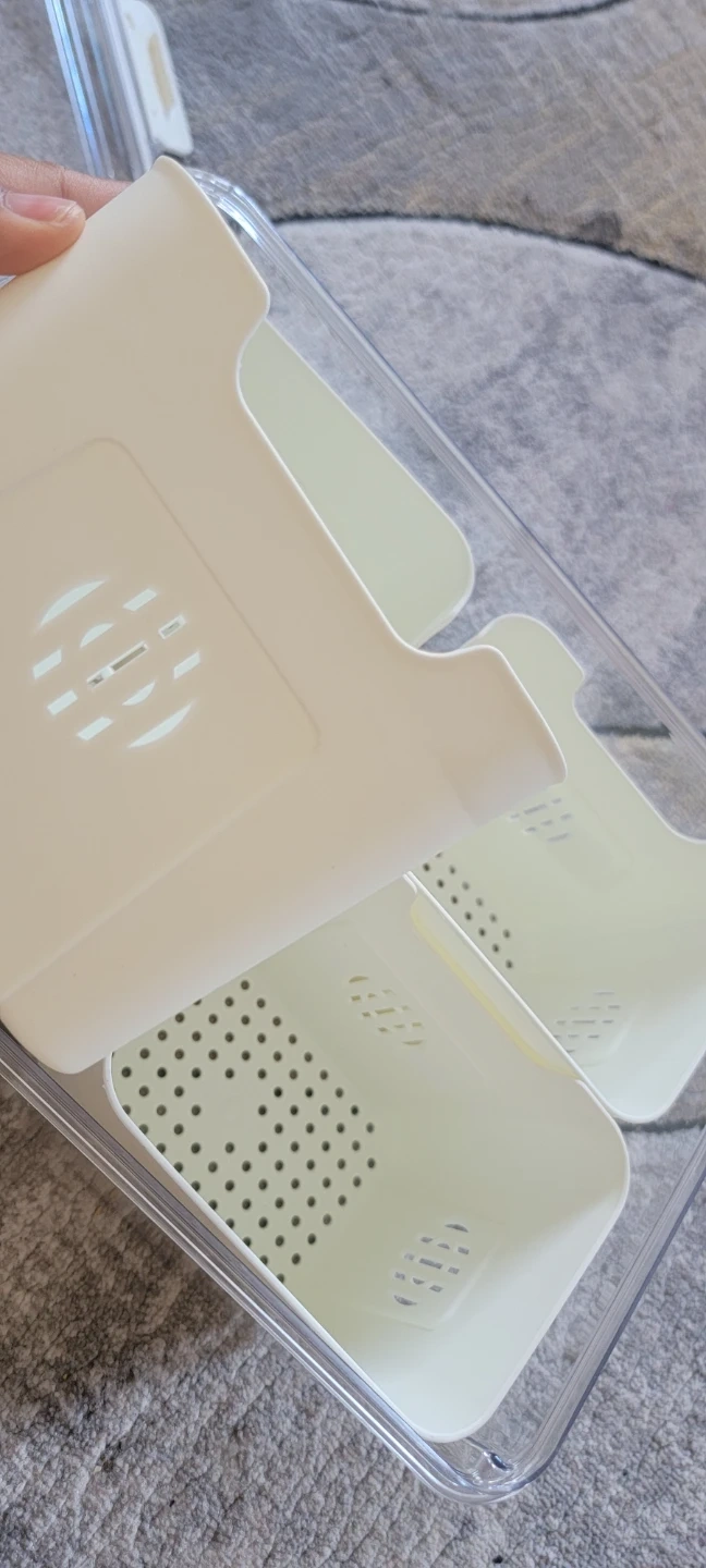 This clear storage container helps keep your fridge organized. It's designed with removable dividers to sort different food items. Built for durable use.