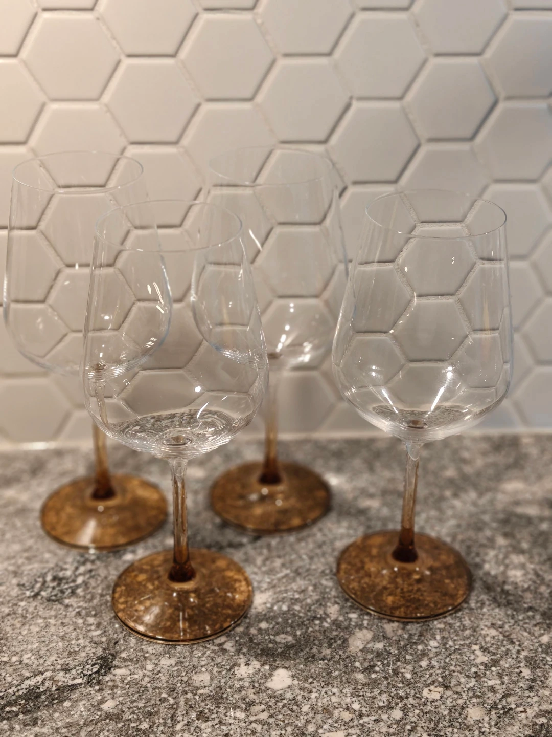 New Mikasa wine glasses with beautiful amber-coloured bases. These glasses are designed with titanium added for durability. They are dishwasher safe for easy cleaning and hold a maximum capacity of 15.25 oz. Perfect for enjoying your favourite wines!