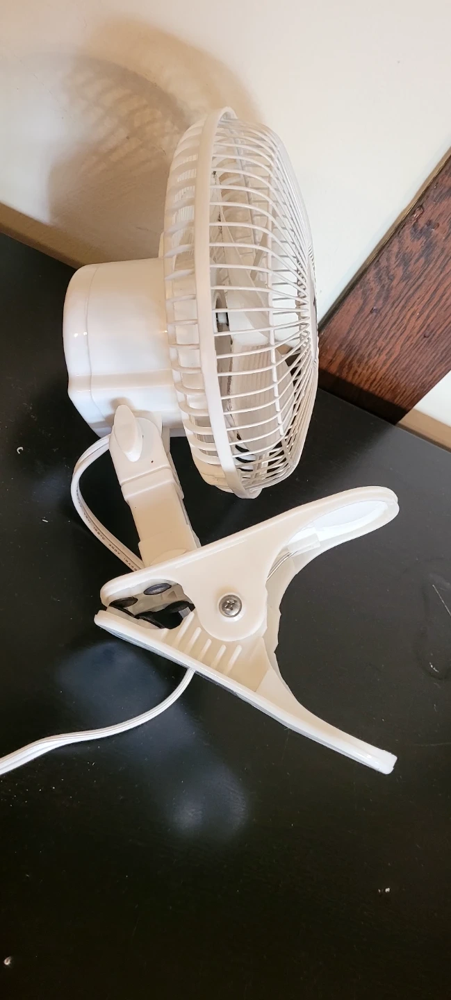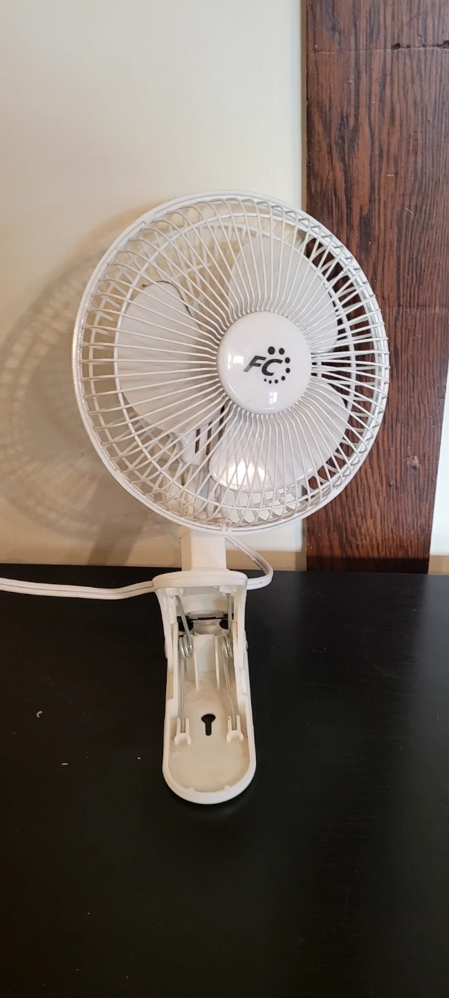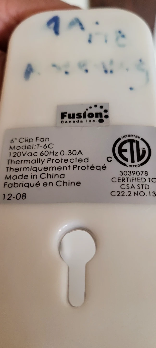 This is a 6" clip fan from Fusion Canada Inc. It's a white, compact fan that clips onto surfaces. Thermally protected, it runs on 120VAC at 0.30A.