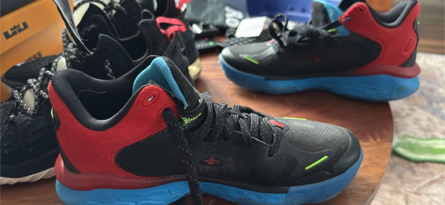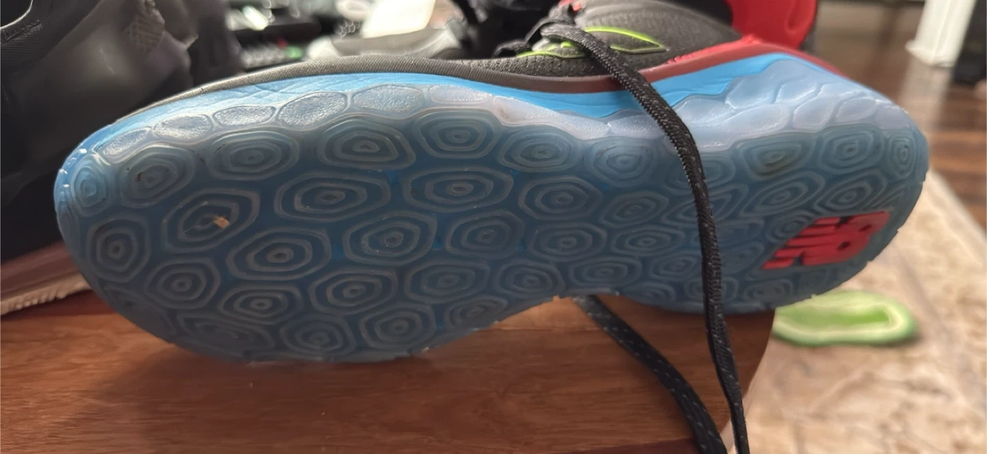 These New Balance running shoes are black with red and blue accents. They feature a breathable mesh upper and a durable rubber outsole for traction. The sole has a unique hexagonal pattern. Perfect for your next basketball game.