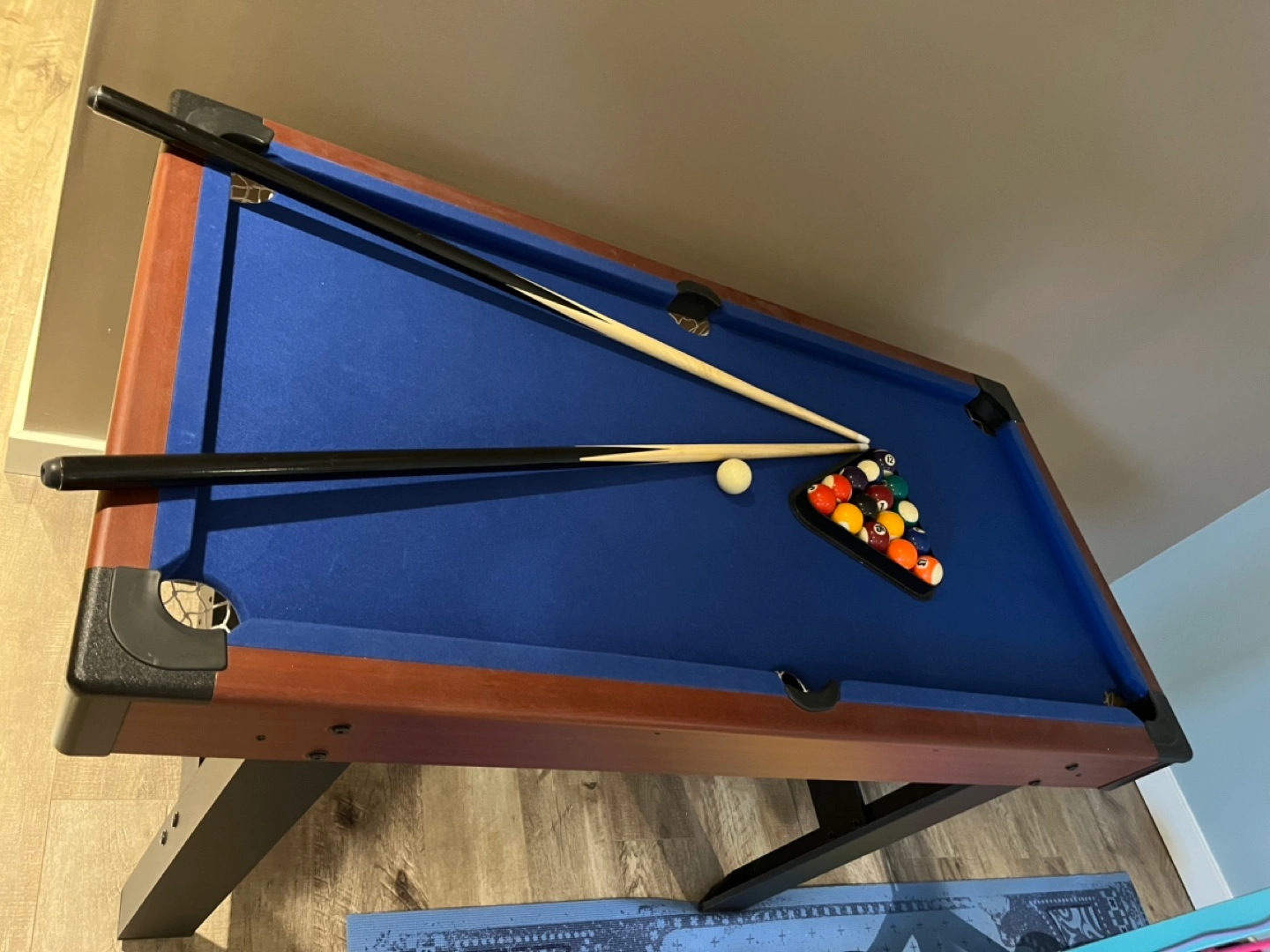 Multi-game table. Features bilard, ping pong, and air hockey. Includes cues, balls, paddles, and pucks. Good condition. Compact size, ideal for smaller spaces.