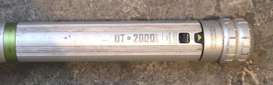 Aluminum flashlight with "DT-2000L" printed on the side. It's a rechargeable lithium-ion model. It has an auto-adjusting light function and an off switch.