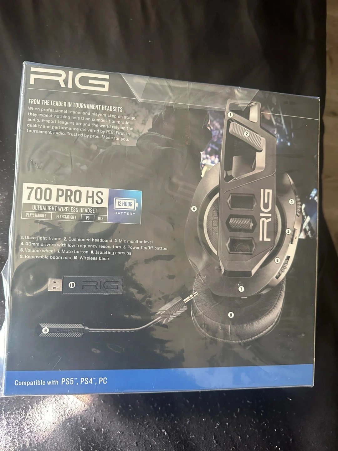 This RIG 700 PRO HS is an ultralight wireless headset with 40mm drivers and 12-hour battery life. It features a cushioned headband, isolating earcups, and a removable boom mic. Compatible with PS5, PS4, and PC.