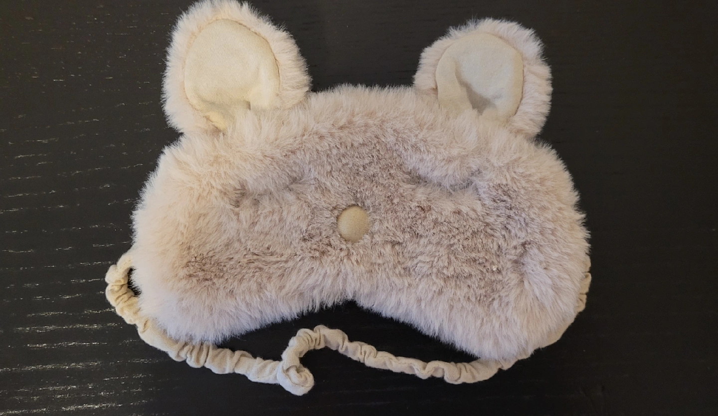 Super cute and comfy fuzzy sleep mask with bear ears.