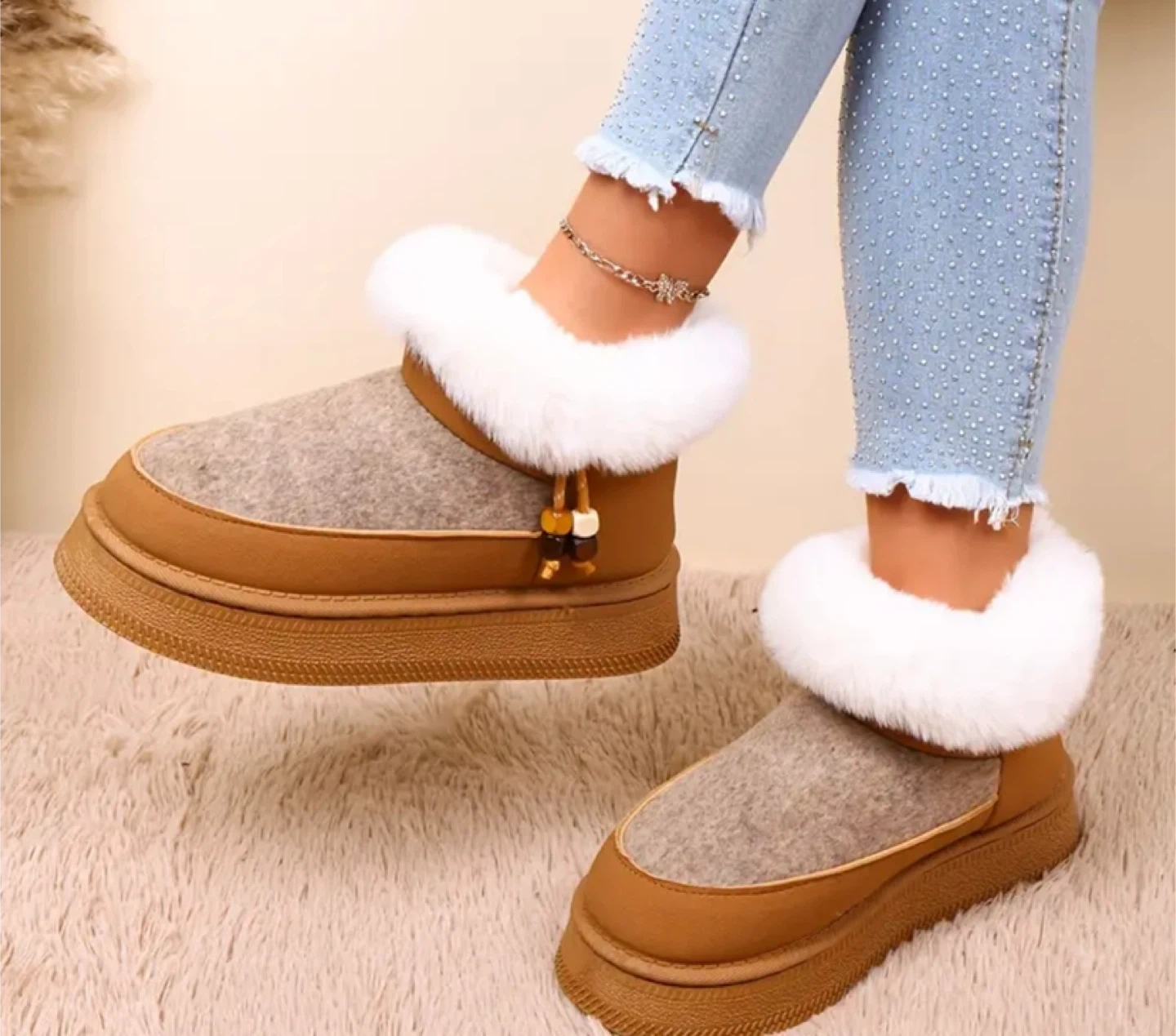 These cozy winter boots feature a stylish fuzzy cuff and a comfortable platform sole. Perfect for keeping your feet warm and adding a trendy touch to your outfit!