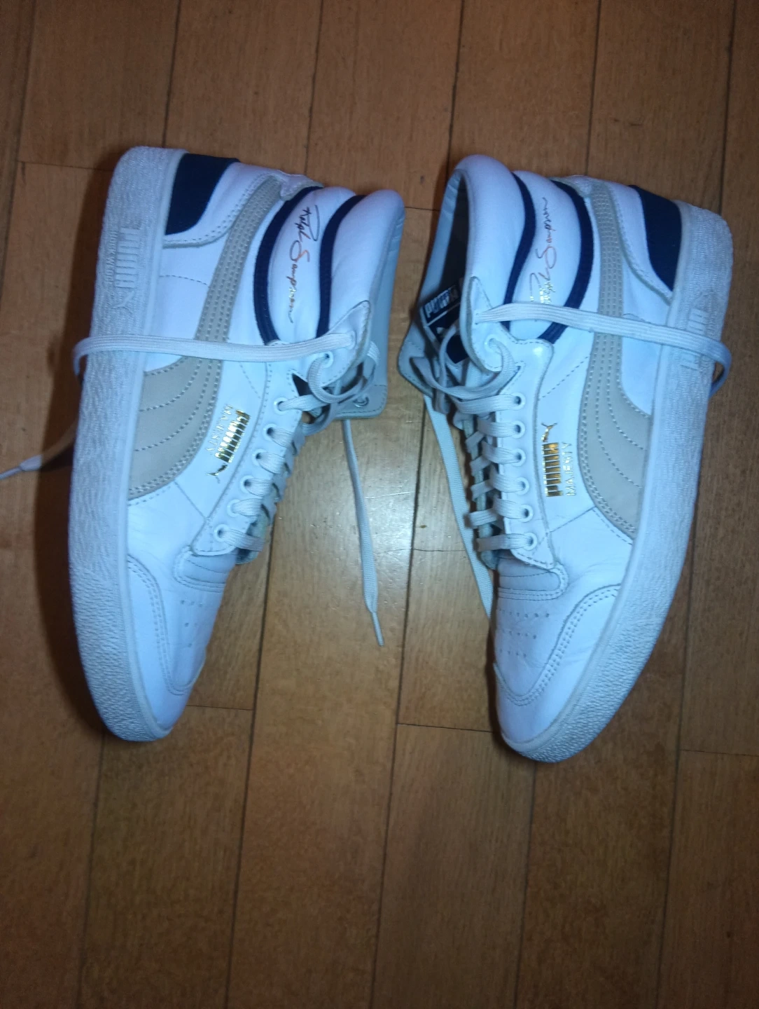 White leather Puma high top sneakers with black and beige accents. Features lace-up closure and cushioned sole. Great for casual wear!