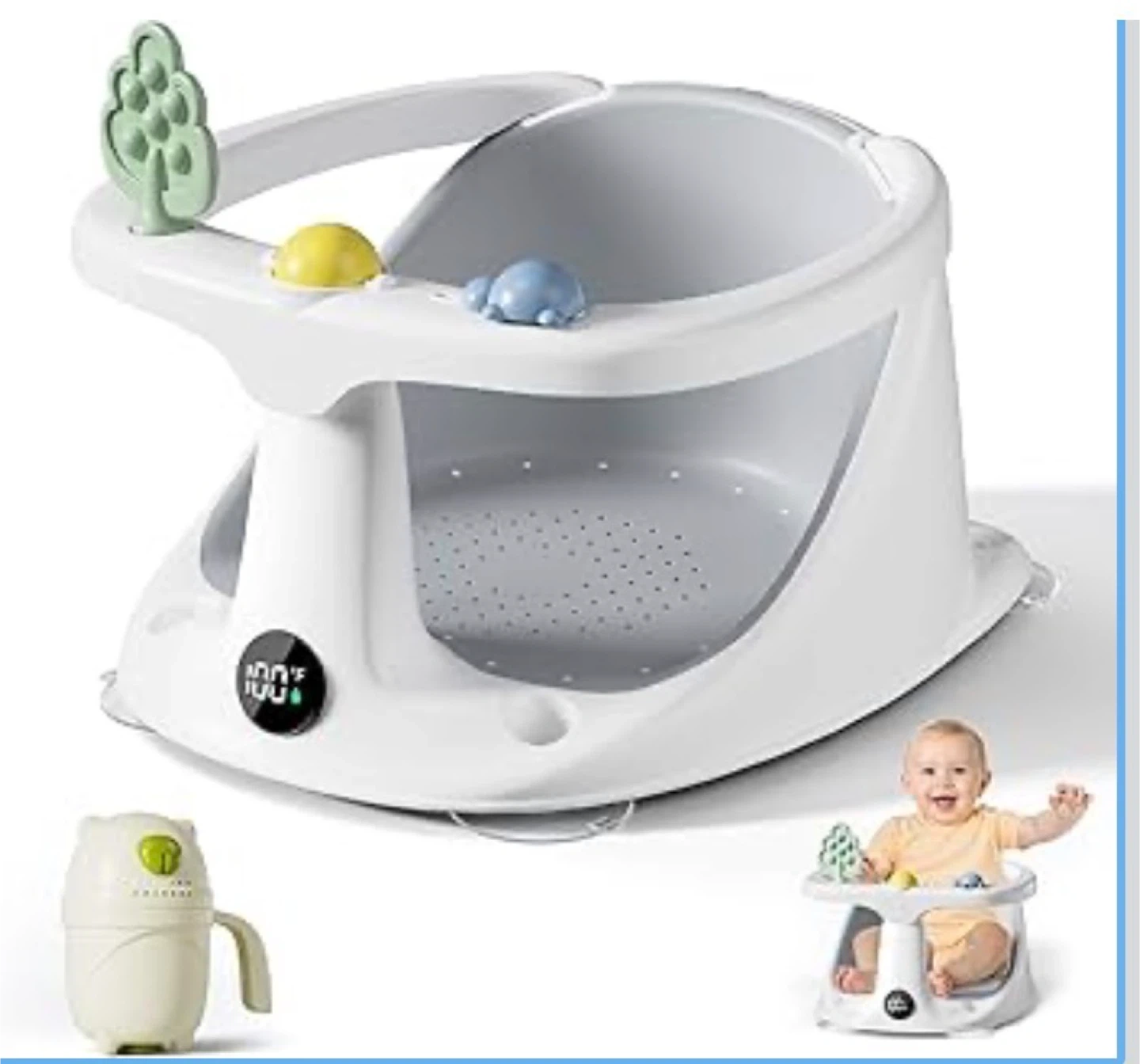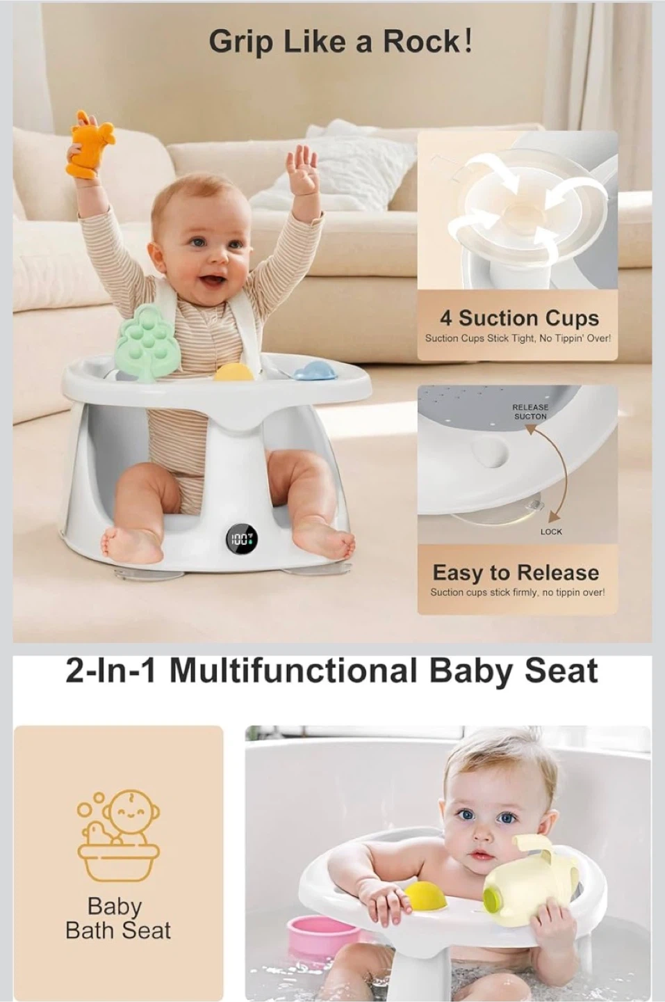 This versatile baby seat is designed for safe and easy bathing. It features 4 suction cups for a secure grip and an easy-release mechanism. It's perfect for keeping your little one comfortable and stable during bath time!