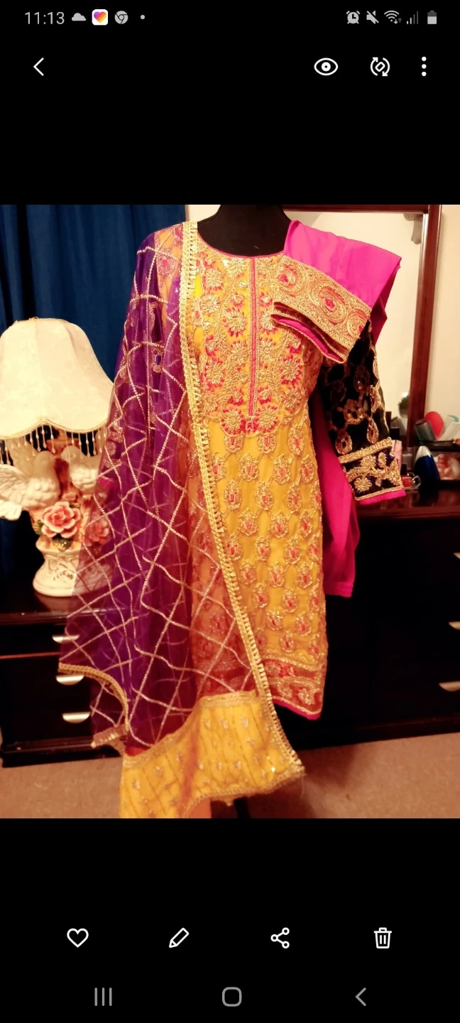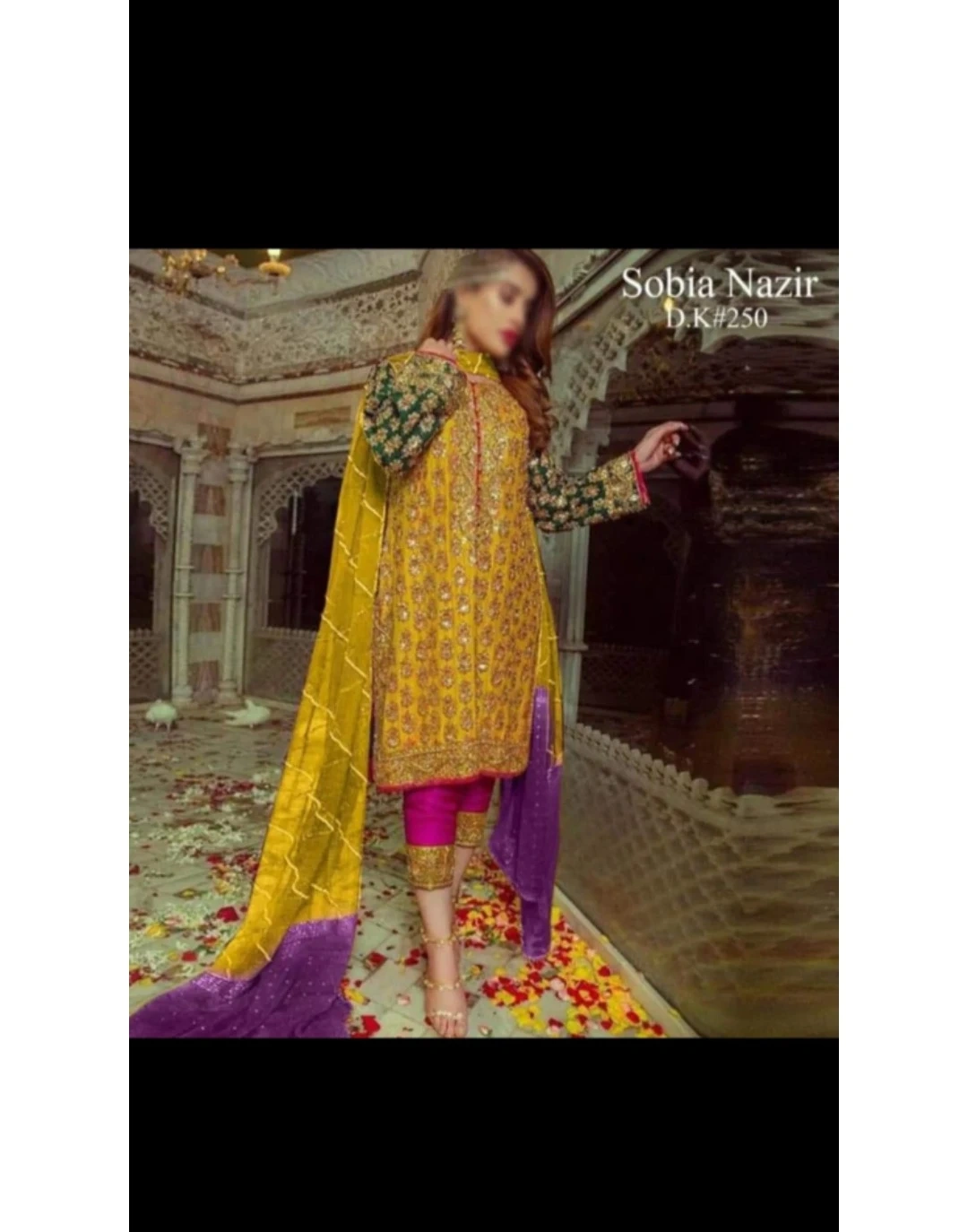 This is a beautiful 3-piece women's dress by Sobia Nazir. It features intricate embroidery and comes with a yellow kameez, pink trousers, and a purple and yellow dupatta. Perfect for festive occasions!