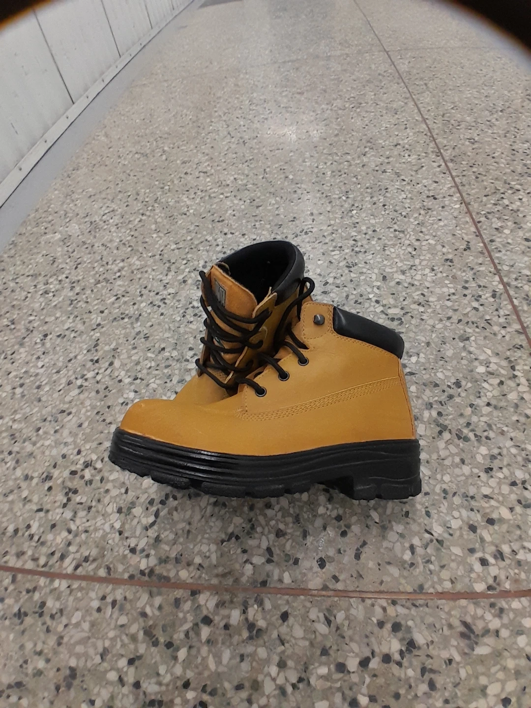 Dakota work boots in a tan suede-like material with black accents. Lace-up closure and a durable black sole. These boots are built for tough jobs and long days men's size 8