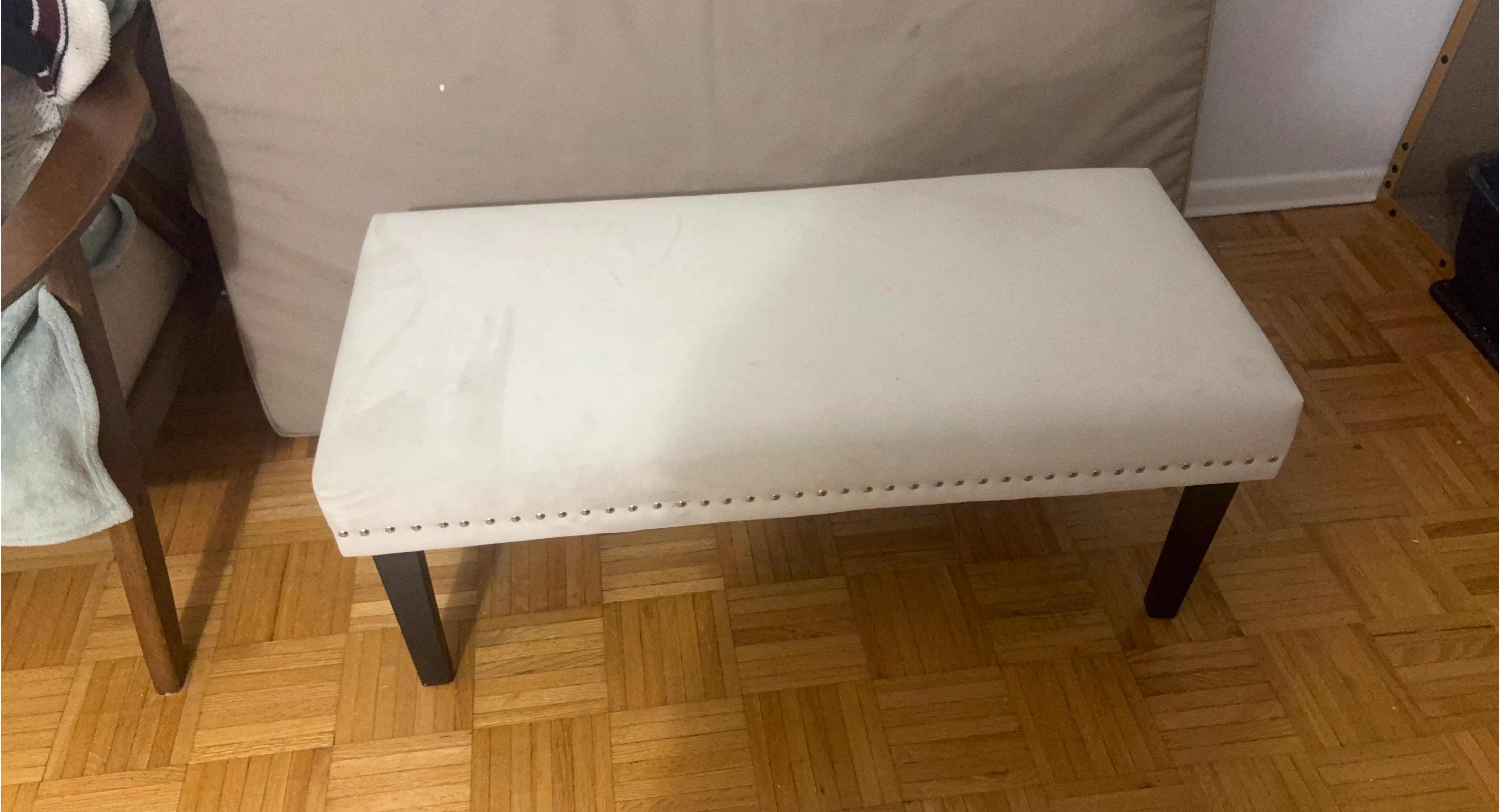 White upholstered bench with decorative nailhead trim. It's great for entryway or foot of the bed. This bench offers versatile seating and storage.