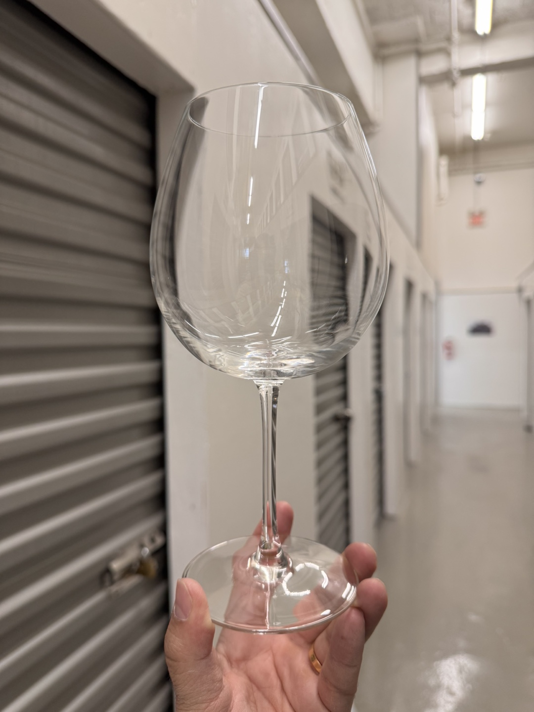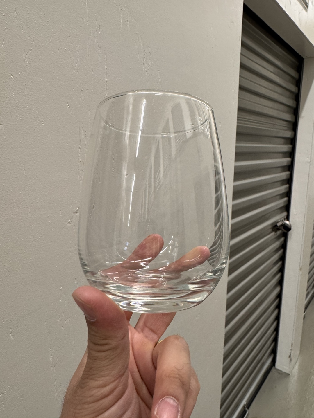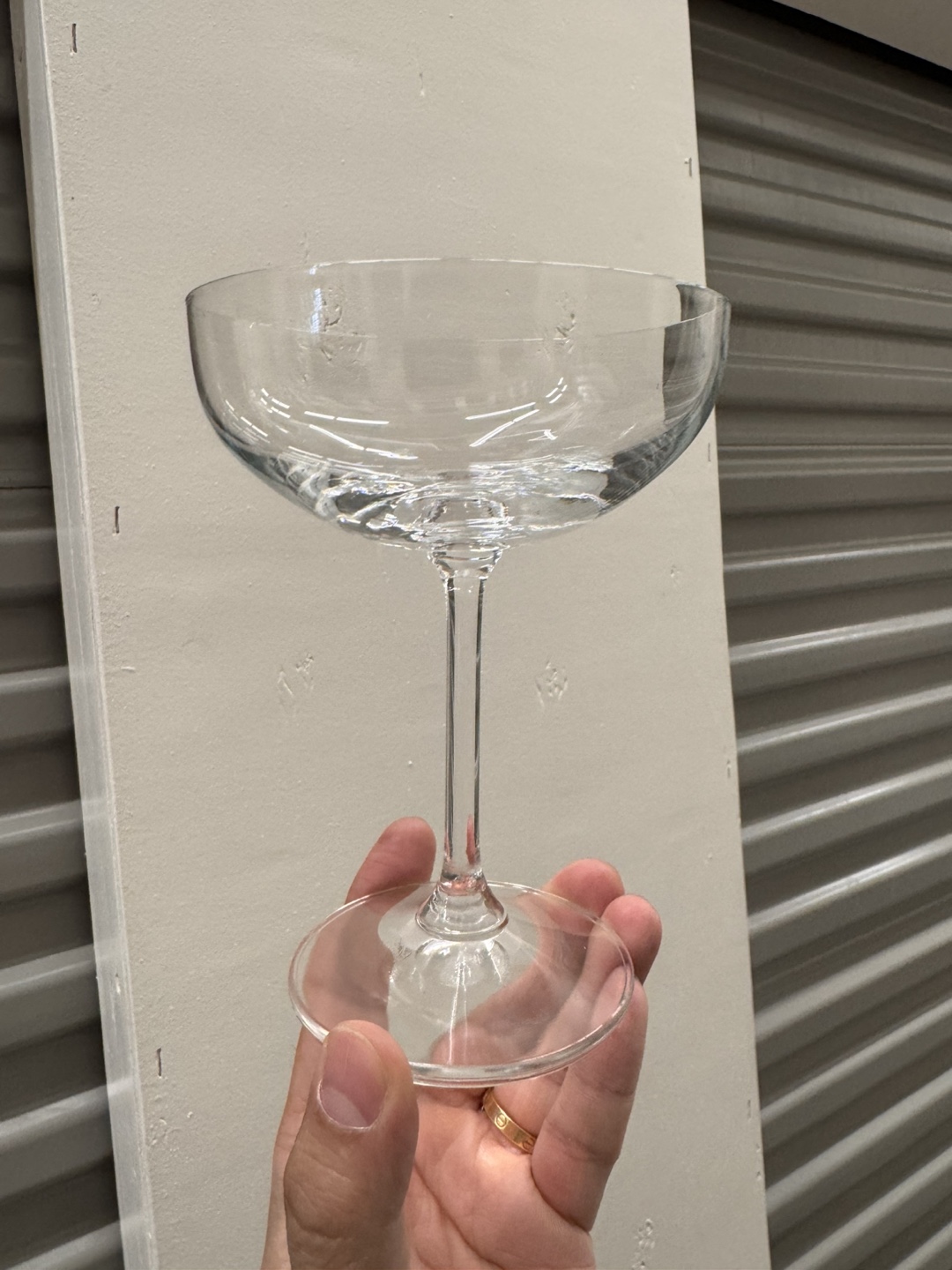 Stoneware dish set including 4 large plates, 4 medium plates, 4 bowls, and 4 mugs, plus 6 red wine glasses, 6 champagne flutes, and 3 water glasses.