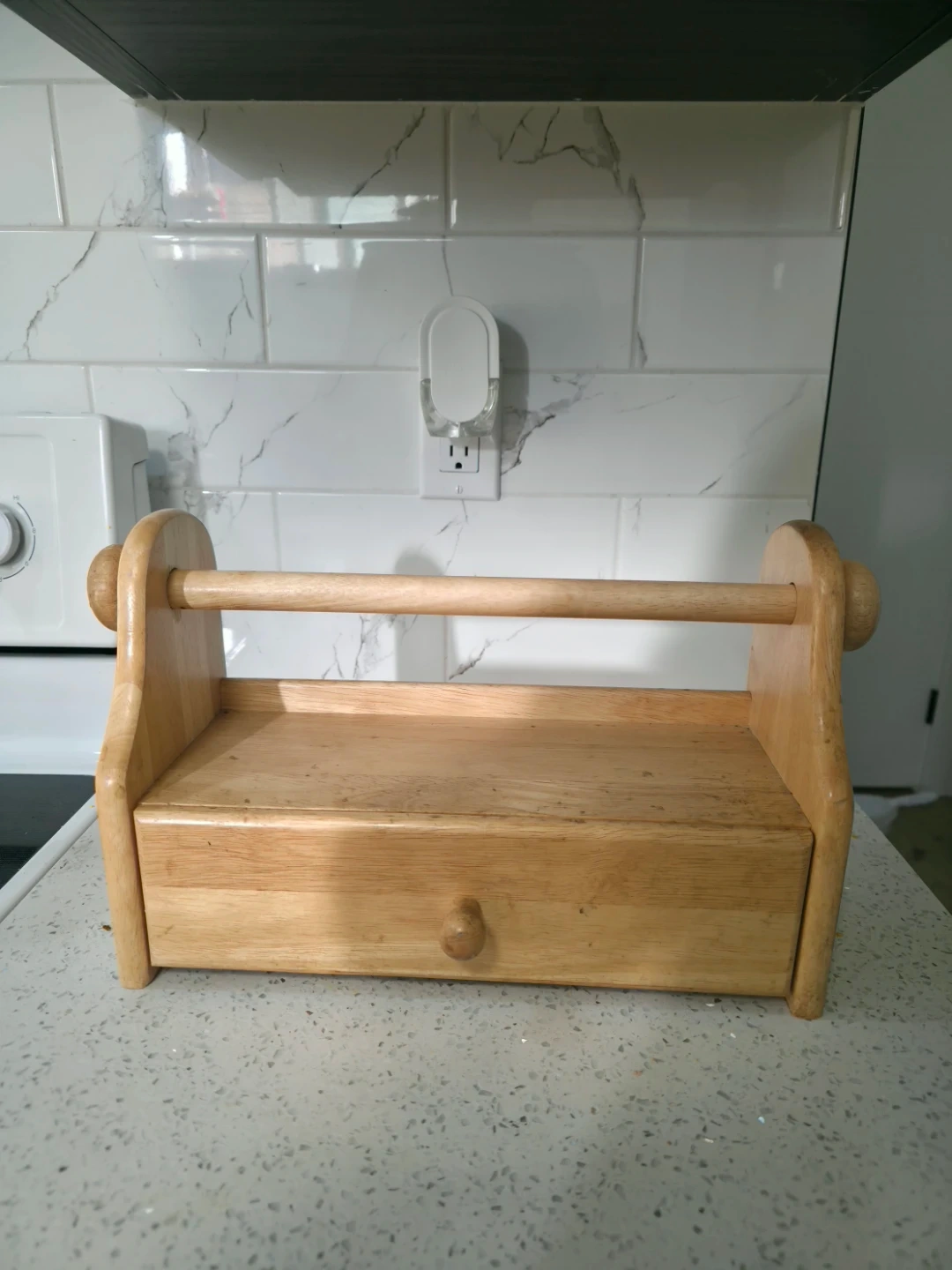 Here's a handy wooden kitchen organizer! It features a drawer and a dowel rod, perfect for holding paper towels or other kitchen essentials. It's in great shape and ready to help you declutter your countertops