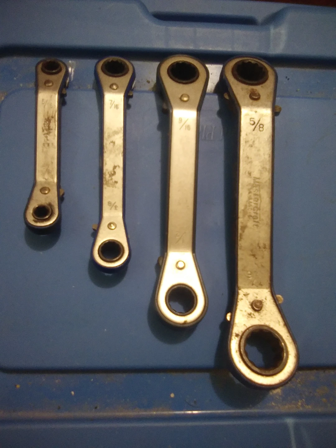 This is a 4-piece set of Mastercraft ratcheting wrenches. Sizes include 3/8", 7/16", 9/16", and 5/8". They are made of metal. Handy for any DIYer or mechanic!