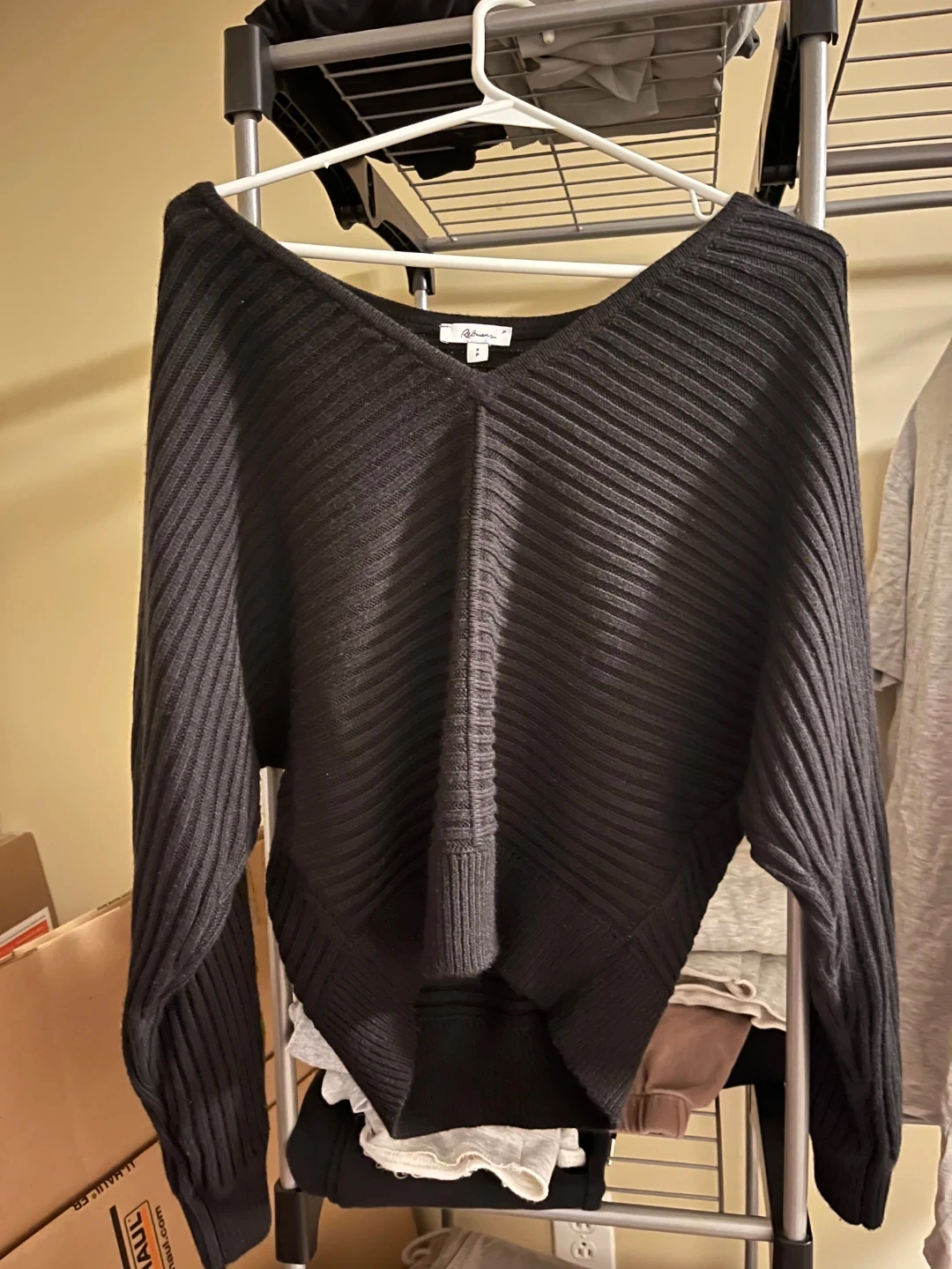 Black ribbed sweater with a V-neck and batwing sleeves. It's a size medium. This sweater's knit pattern adds texture and style. Size small
