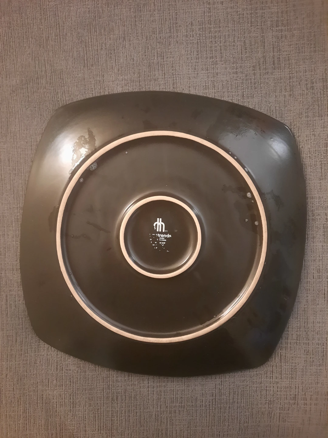 The plate features a distinctive square shape and a two-tone design. It has a deep crimson (red) interior and a matte black exterior/rim.
