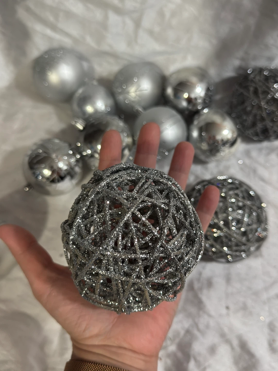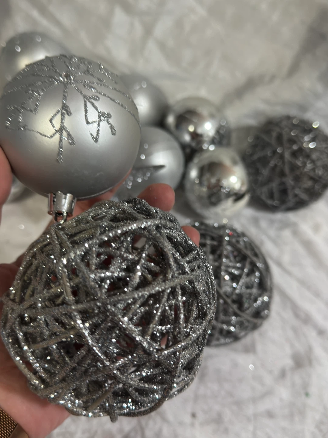 A set of silver-toned Christmas ornaments in various finishes. Includes smooth, glitter-covered, and woven ball designs, plus a star tree topper. Perfect for decorating your holiday tree!