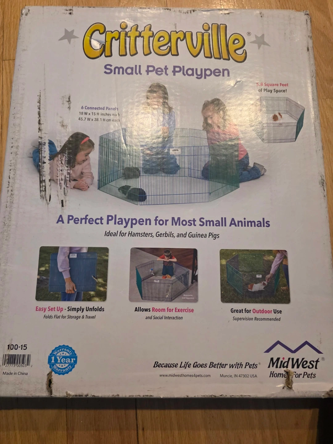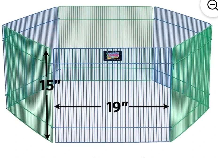 This is a Critterville small pet playpen with 6 connected panels. Each panel measures 18" W x 15" H. It provides 9.5 square feet of play space. It's ideal for hamsters, gerbils, and guinea pigs!
