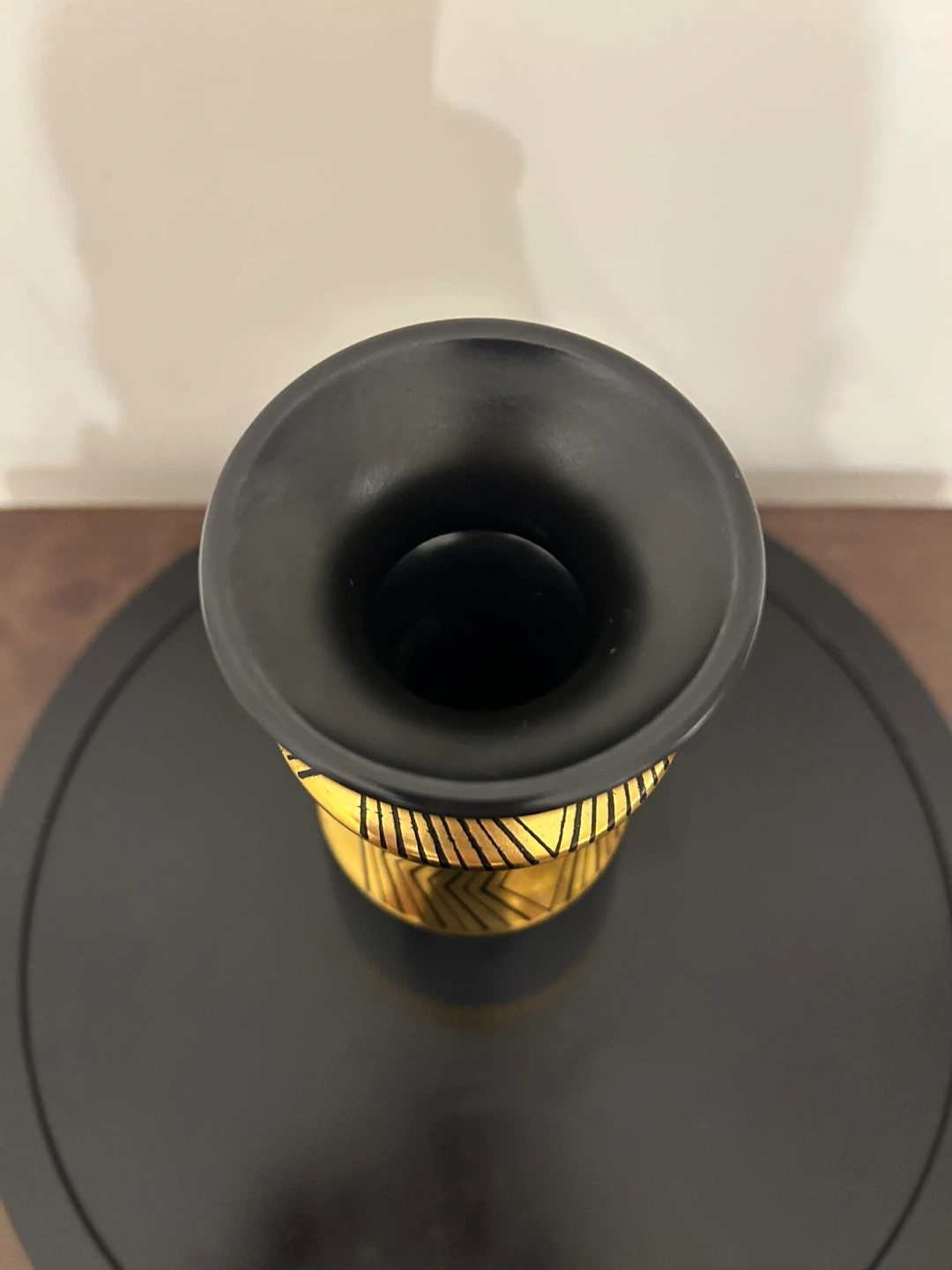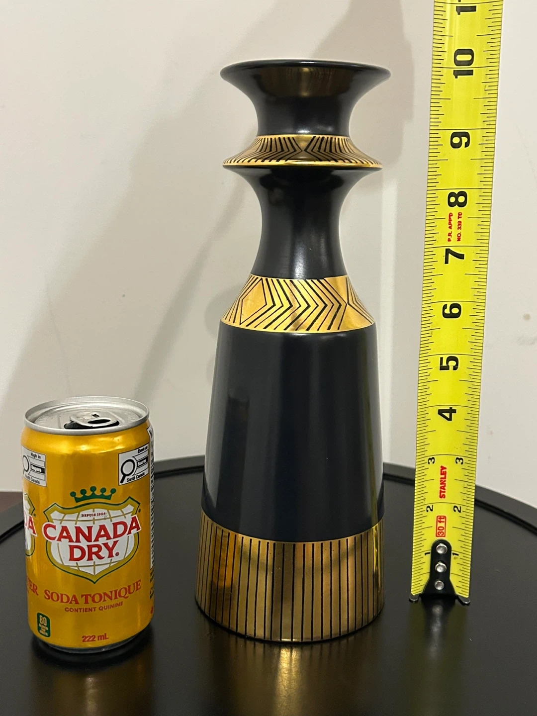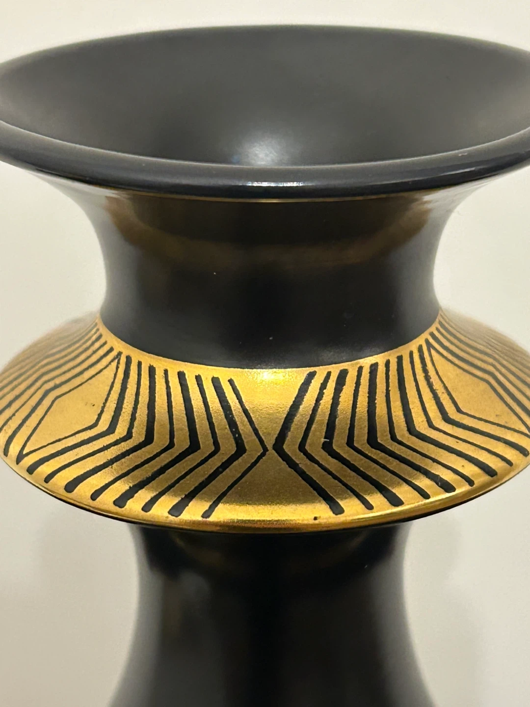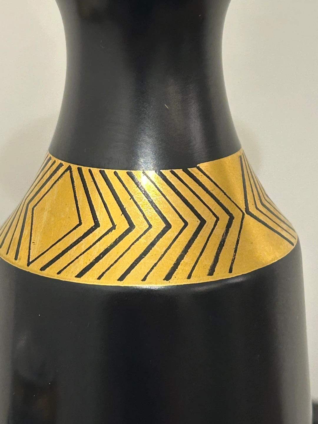 This CM7 model perfectly captures the elegance of the Space Age and Mid-Century Modern movement with its tall conical silhouette and striking matte satin black glaze. The surface is beautifully enhanced with hand-etched (sgraffito) gold geometric decoration, giving the piece a refined yet bold architectural presence.